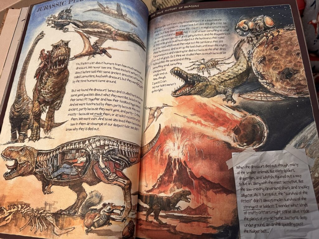 Physically, the book is gorgeous. It’s big, heavy and illustrated breathtakingly. It’s a sort of scrapbook where memories, sketches, notes, myths, diagrams and cultural leftovers sit side by side in chaotic harmony. The Last Book is a world building compendium that looks very much like it was assembled on the floor of an escape pod using whatever Noah had on him, which luckily seems like a lot.
