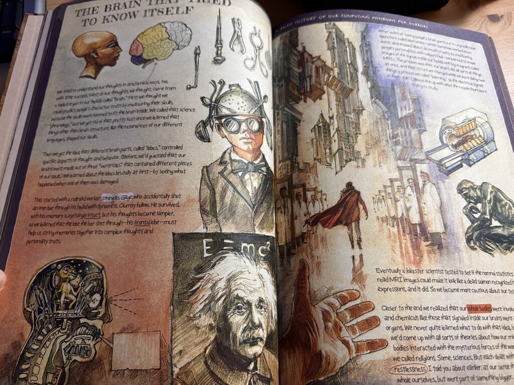 Long reading sessions are not ideal. The book is physically too dense, too lovingly cluttered, and too intentionally overwhelming. But in short bursts, it shines. Each page is a little campfire for you and the last earthling to huddle round.