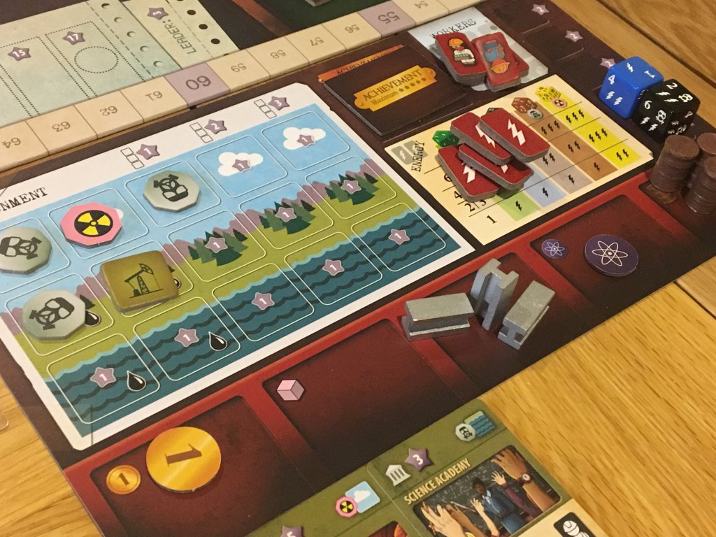 The basic just of The Manhattan Project: Energy Empire is one of building out an efficient tableau that balances aggressive energy production (and the ability to take more actions) with minimising pollution. There are several other themes however, such as the way that factors like UN influence and science impact endgame scoring.