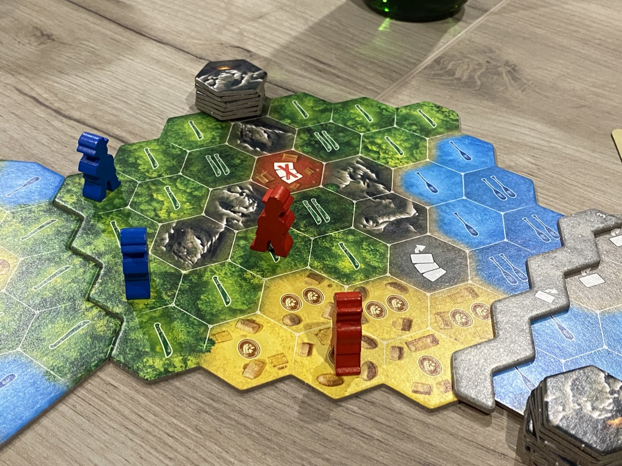 At three or four players, each player has a single adventurer miniatures on the board to represent their party, and blocking other players based on the layout of the map is a critical part of play. Mountain regions, for example, are impassible in the base game (although an already released expansion adds an item to overcome this) so blocking players in tight paths is a key strategy. At two players, each player has two expeditions on the board, which changes the dynamics of play more than you might think.
