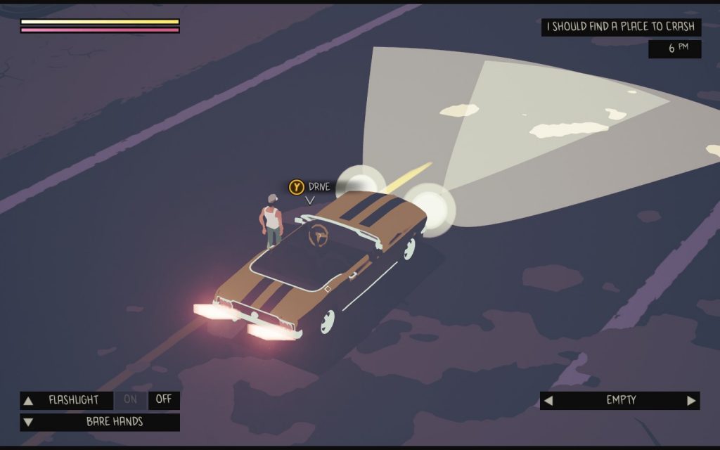 It plays as a 3D 3rd person survival game, in which you (currently) start off in a car on a road in the desert with the task of finding somewhere to crash for the night. You drive along the road until you discover a few buildings that make up a motel complex and petrol station. Getting out of the car zooms the camera into your character as you explore the area picking up the plethora of weapons that are scattered about the place (demo, remember that this is a demo!). There are people dotted about that you can’t currently interact with, and some weird moose-head skeleton looking dudes that attack you if you get close.
