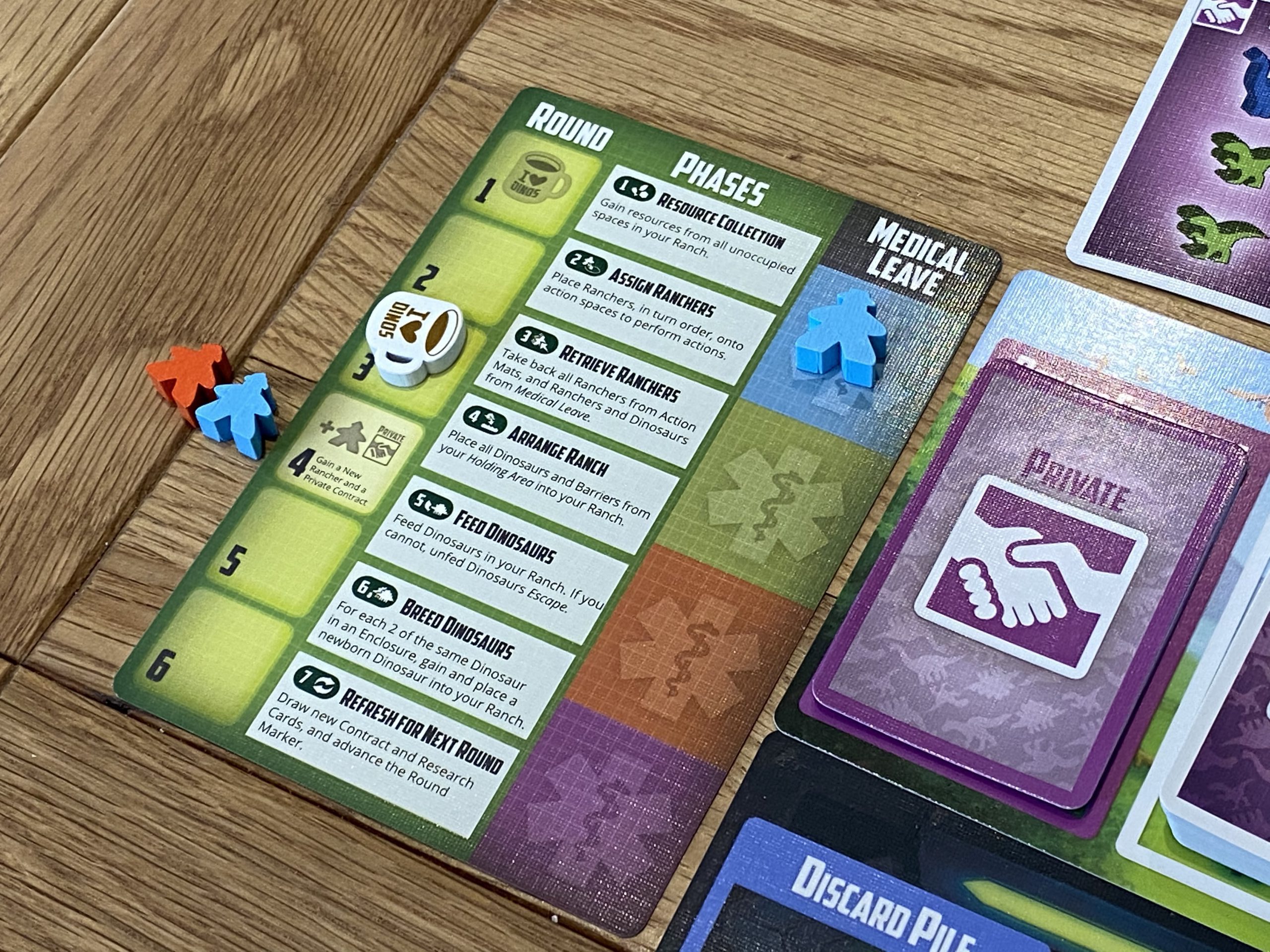 Later on in the round, the players will also retrieve their ranchers, arrange their park, feed their dinosaurs and breed their dinosaurs — all before refreshing any unclaimed science cards and replenishing the contract cards if needed. Before any of these phases however, the players must take turns to place their rancher meeples.