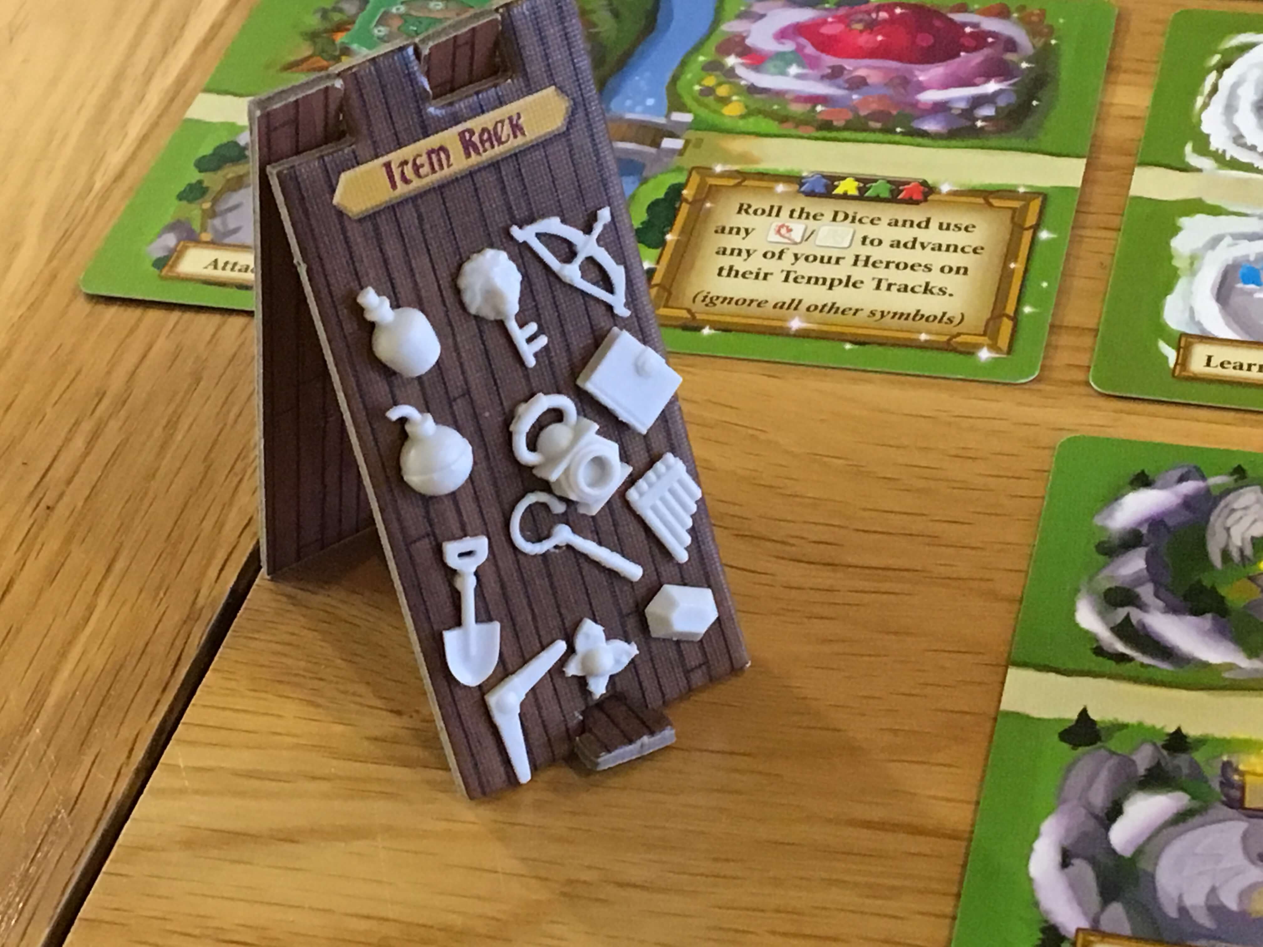 There are also scrolls and torches to roll, which can be used to help meeples progress through a dungeon or temple. Again, these rolls benefit all players, but each adventure location has different requirements, so they may benefit different players at different times. Resolving some quests provides a legendary item, resolves a quest or lets the players progress their personal weapon track upwards to obtain one of the three basic weapons.