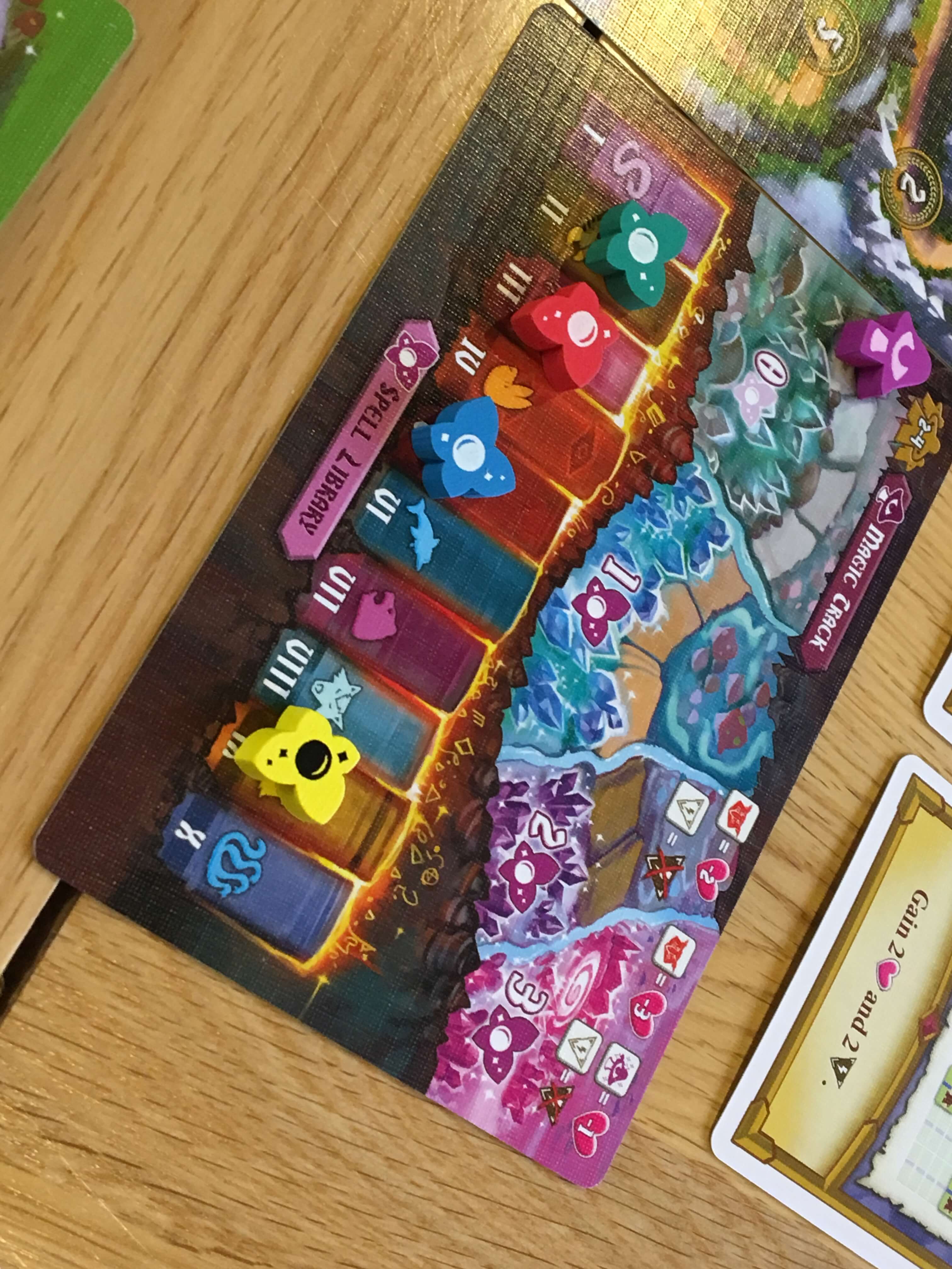 The reason for movement is to position meeples on the locations you’d like them to occupy during the night phase, which lets you do things that score points. Landing on a temple, for example, might let you complete it during the night. Landing on a goblin might mean you defeat it, whilst landing on a magical totem might let you roll dice to increase the magic track, which may in turn grant access to spells above your current spell level.