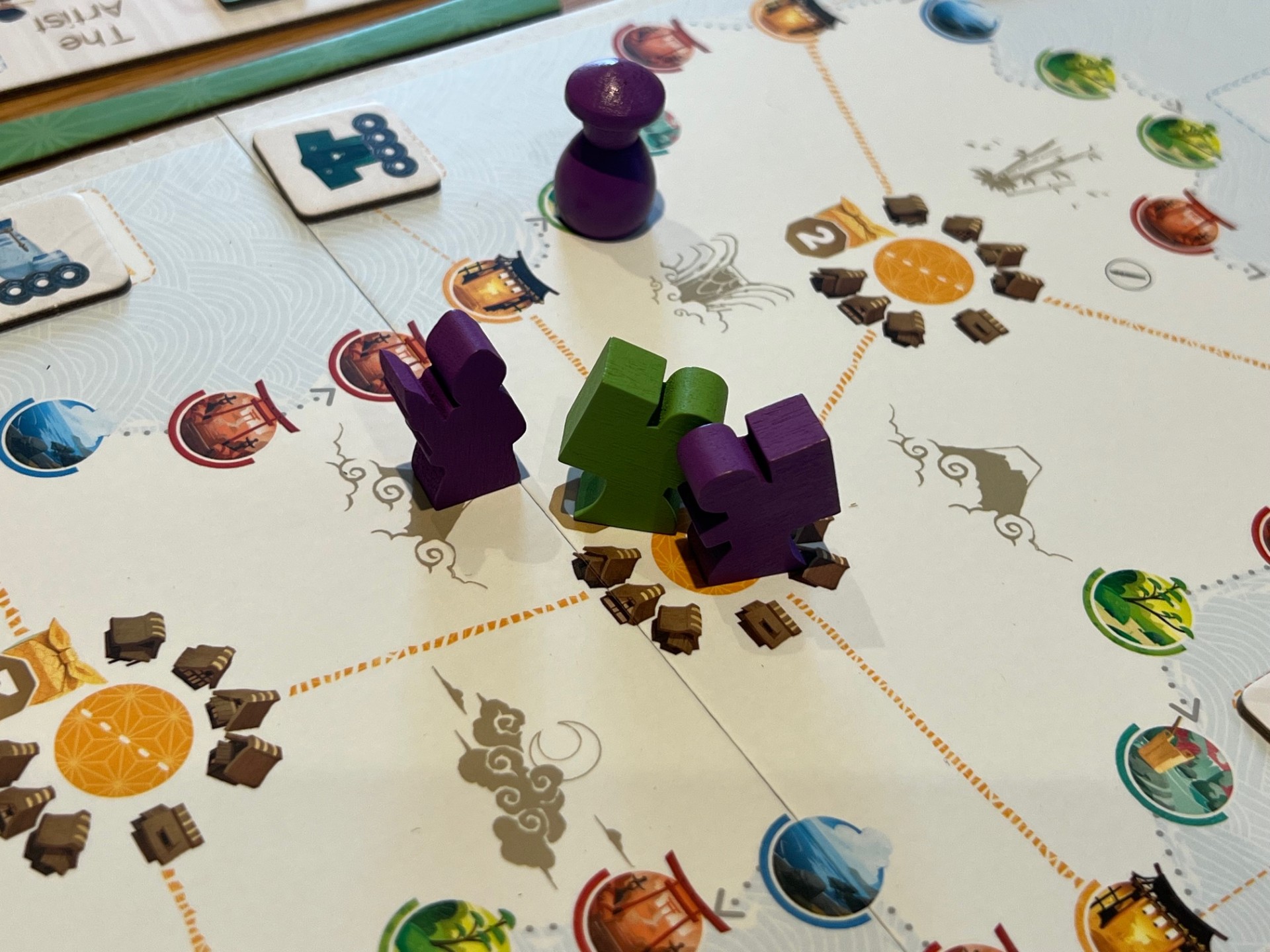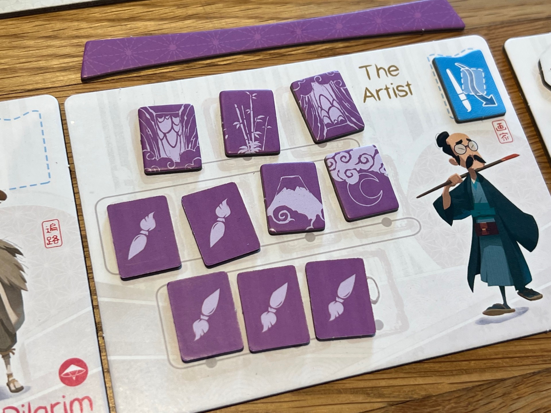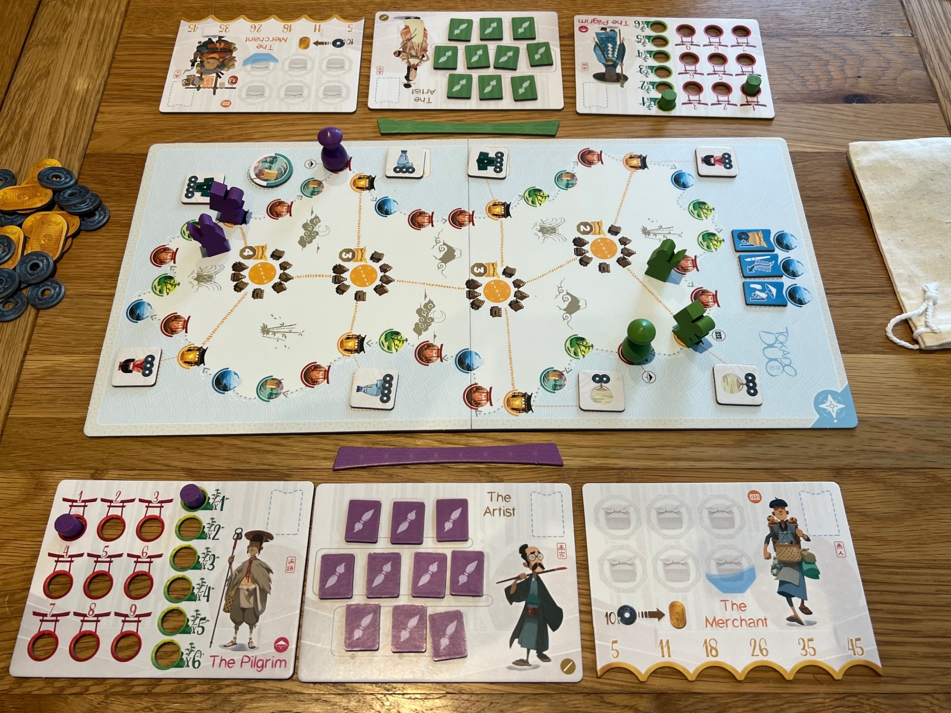 Each character operates under its own ruleset. The pilgrim travels between temples, towns and forests, collecting blessings and unlocking spiritual rewards. The merchant moves from village to village, trading goods and earning coins. The artist seeks inspiration by visiting scenic locations and painting landscapes, then handing out their artworks. These roles are not just thematic but mechanical — they create distinct tactical layers, forcing the players to juggle priorities and optimize movement across a shared board.