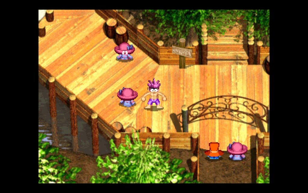Tomba! follows the story of a little, pink-haired, feral child of the same name, you’ll run around jumping, biting and occasionally kind of chatting and helping people… but mostly jumping, biting, throwing and hitting things. It takes place in a strange world of floating squids, emotive plants, civilised mouse-people and, very specifically, evil pigs. The evil pigs have stolen Tomba’s grandfather’s bracelet, and you have to get it back.