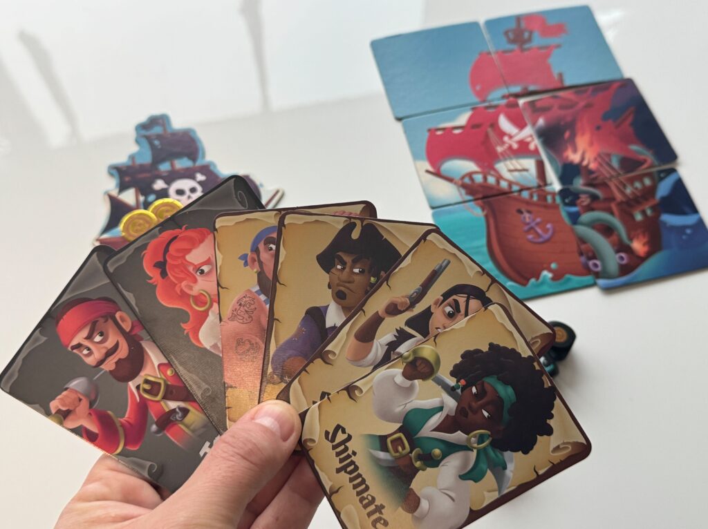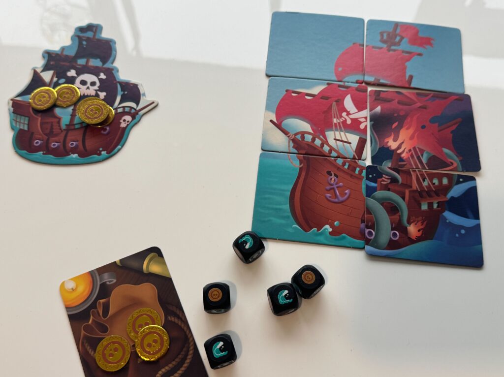 However, if you bank out before rolling three waves then you’ll gain coins equal to the face on the dice, and as the shipmates’ total at the end is the sum of their scores, it makes sense for them to bank low and often. The negative is that anytime there are more pirate flags face up than swords, the difference is put on the rival ship, and if the ship takes damage (from three waves) it also gains gold. That and, of course, the traitor(s) will be trying to get as much gold as possible as their score is the sum of traitors and rival ships.