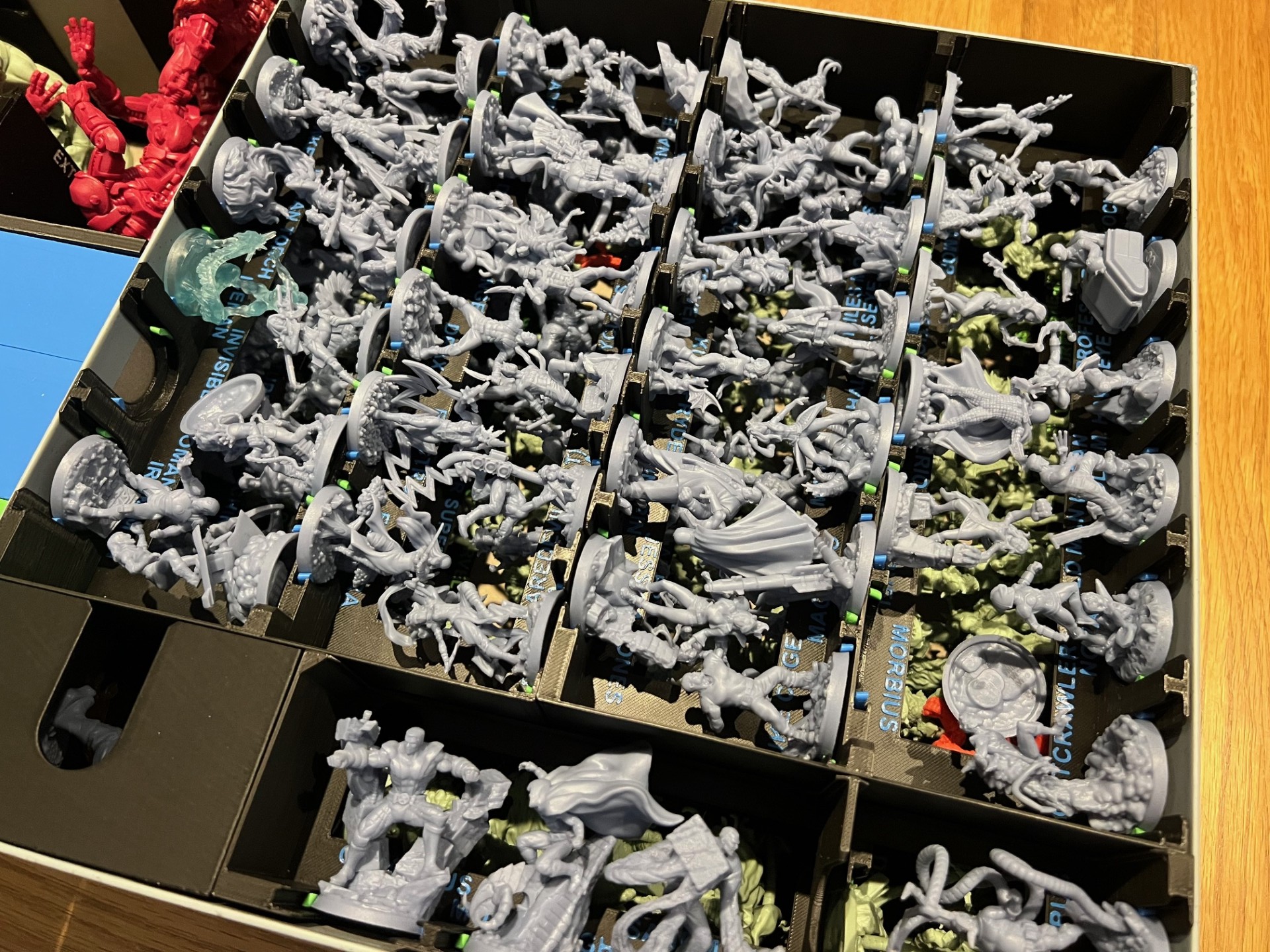 For me this space saving was huge, but in addition I wanted to increase the playability of the game, since the whole point of Marvel Zombies over other Zombicide games is that you can just grab your favourite heroes and get stuck in. TurtleBox3D support this process by creating an insert that stacks with the miniatures accessible in an “open-faced” way. That means no miniatures being slid to the bottom of large stacks, and each one even has a named (and colour coded) slot for the hero and zombie hero variants.