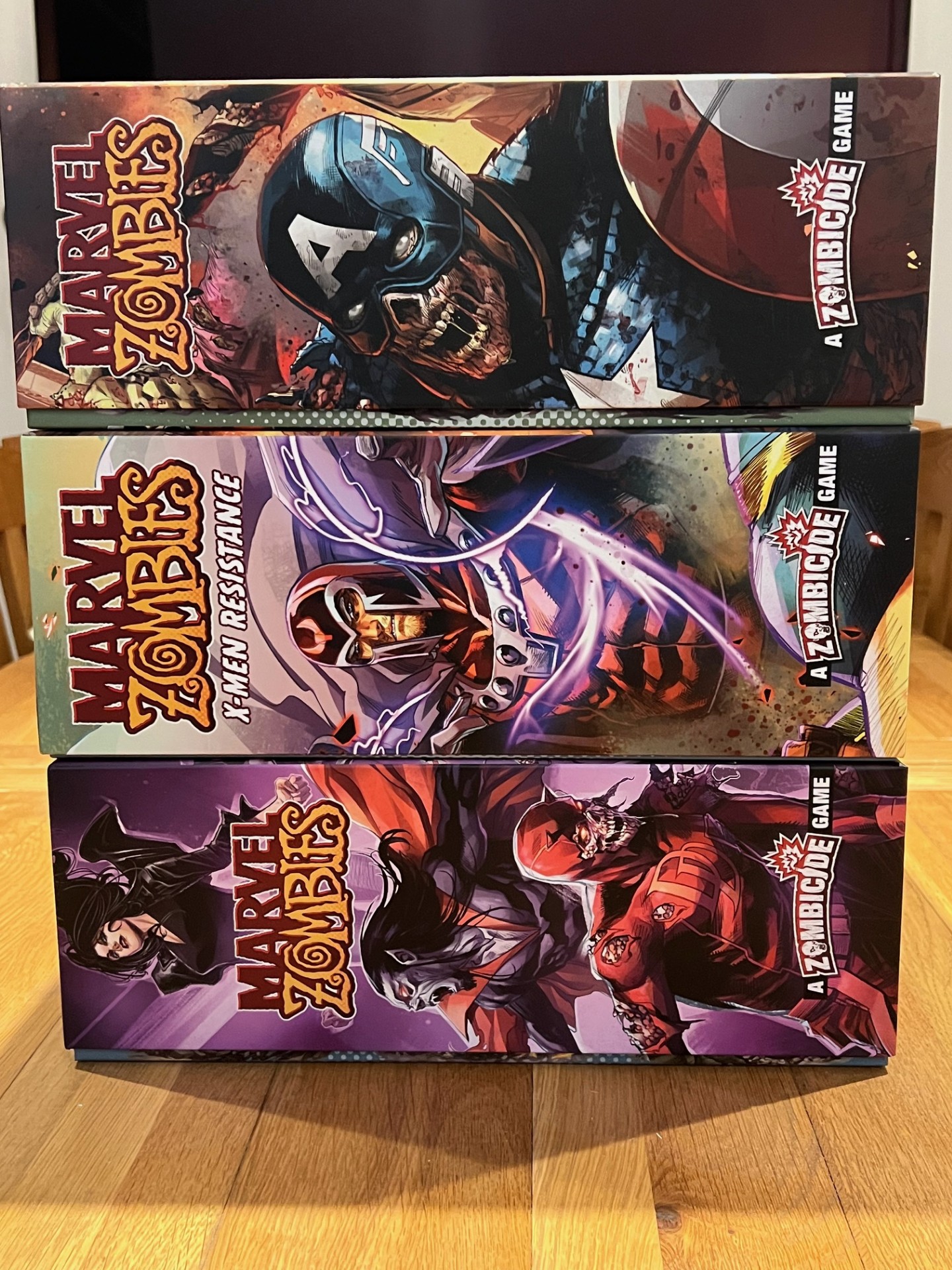 Let’s face it, CMON’s Kickstarters are outrageously pumped up with expansions and extra content that each comes in its own box, with its own crappy plastic insert, often embedded inside another box inside the box and so on. With specific respect to Marvel Zombies, this means that if you want to play with (or against) specific heroes, you have a huge overhead in setup time, not to mention a need for lots of space as you unbox things and move these huge boxes around.