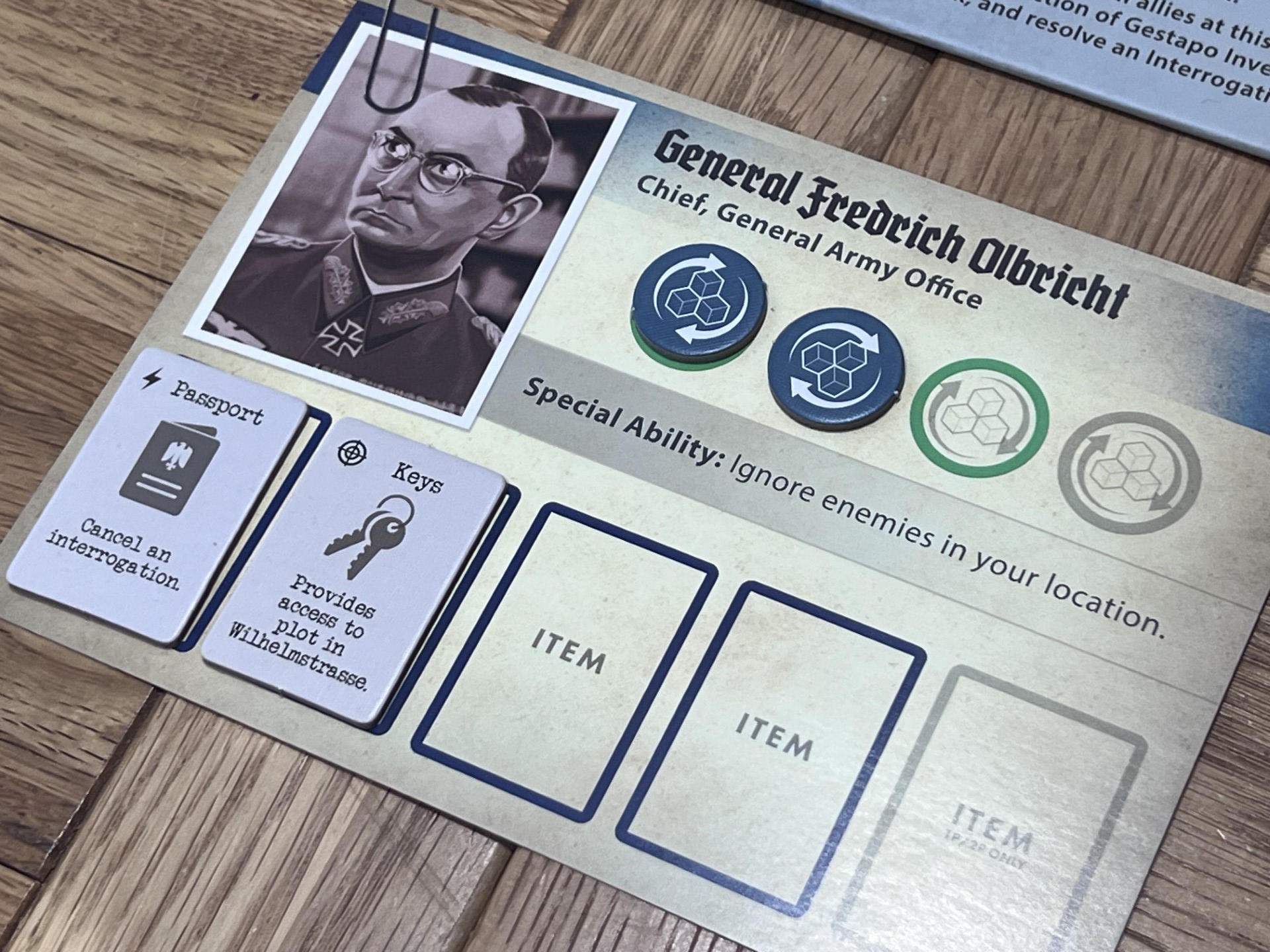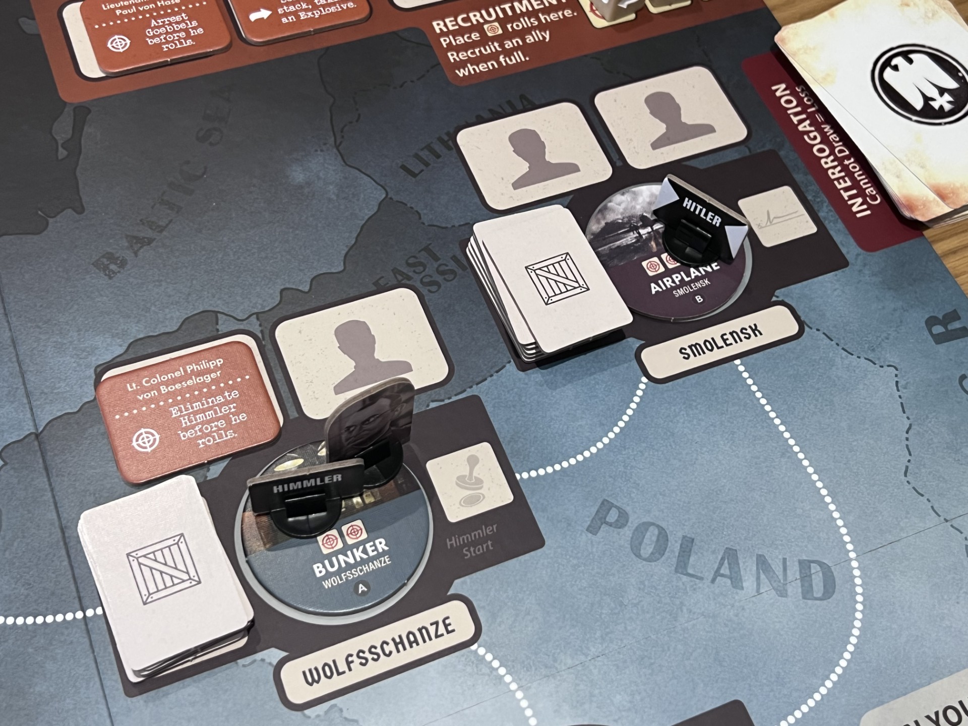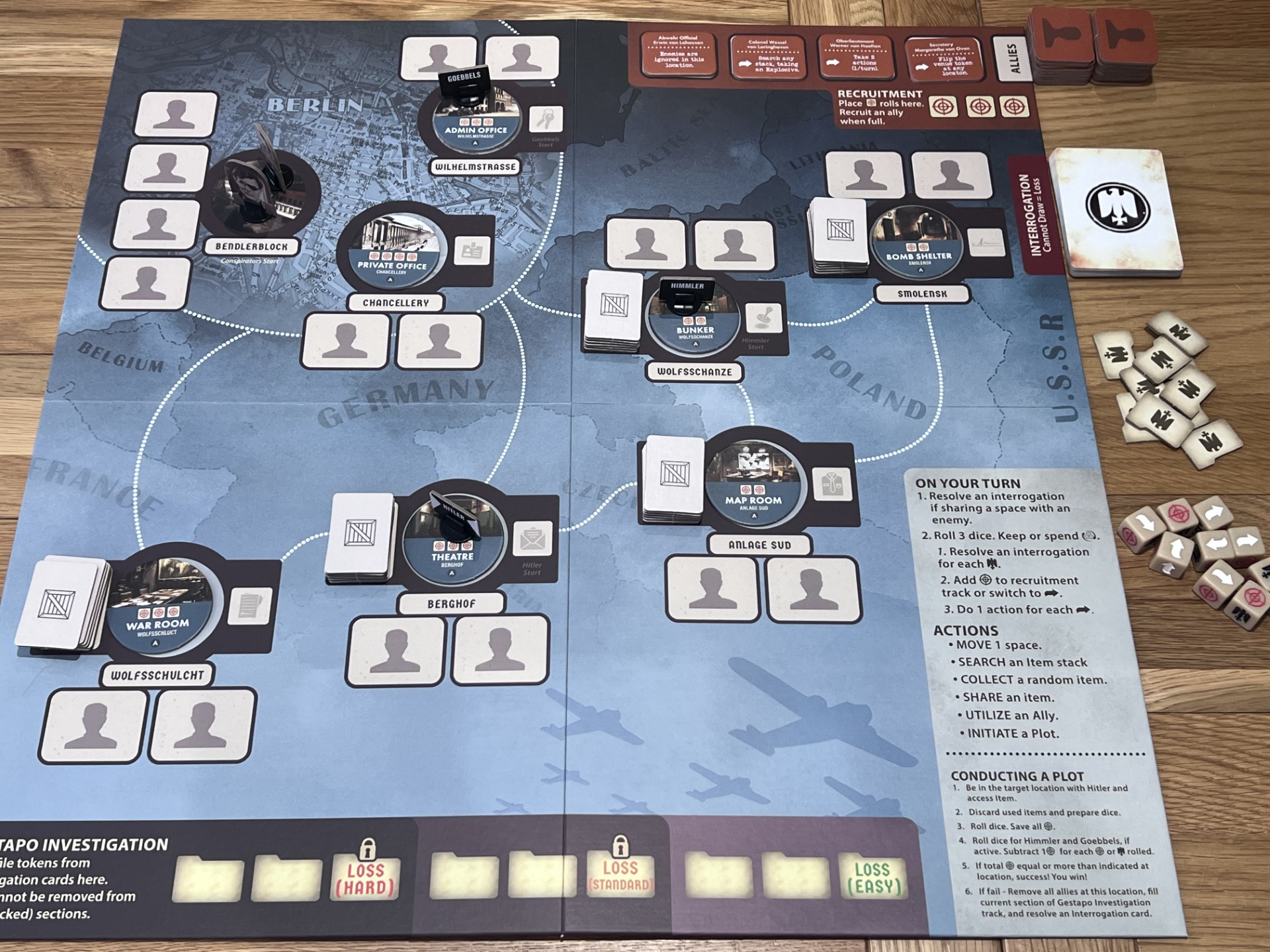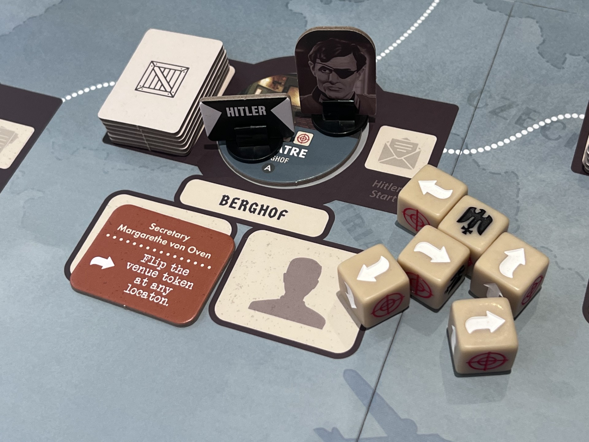 The assassination attempts themselves are more focused and thematic. Rather than a wide array of plots, Valkyrie centres on explosive‑based plans tied directly to Operation Valkyrie. This gives the game a stronger narrative spine, reduces the item combinations and reinforces the idea that players are working towards a single, monumental act rather than a series of abstract possibilities. The dice‑driven resolution remains, but the modifiers and preparation steps are clearer, making the outcome feel more tied to your decisions than to luck alone.