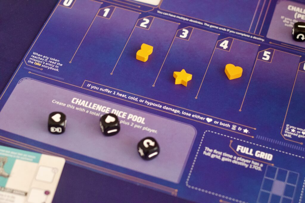 Starting boost tokens are placed on the character card (more on this later). Slap down the central board to keep track of everyone’s time, health and morale, grab some challenge and skill dice and then it’s time to race to the escape pods before the ship is destroyed. A roll of the skill dice will determine the shared mission out of twenty-one possible options, as well as starting skill tokens for each player and where exactly on this vast world you have unceremoniously smashed down. Grab your oversized location card and position it in front of you in the nifty provided holder, making sure your crew mates can’t peek at it.