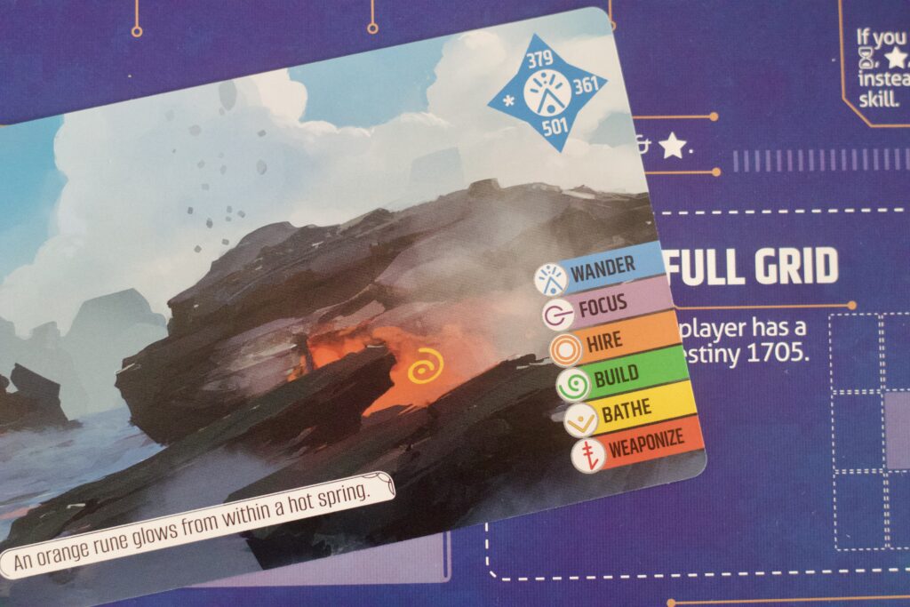 Player turns in Vantage all follow the same structure. Each location card presents a first person viewpoint, you can freely describe to your fellow players what you see along with your possible actions shown on the card, in fact it’s strongly encouraged, communication and cooperation are king here. Or of course you could simply continue your journey and move on. Each of the six actions on the card is linked to one of the core skills identified by their colour and rune. For example you might see a Look option “study” or an Overpower option “hunt”.