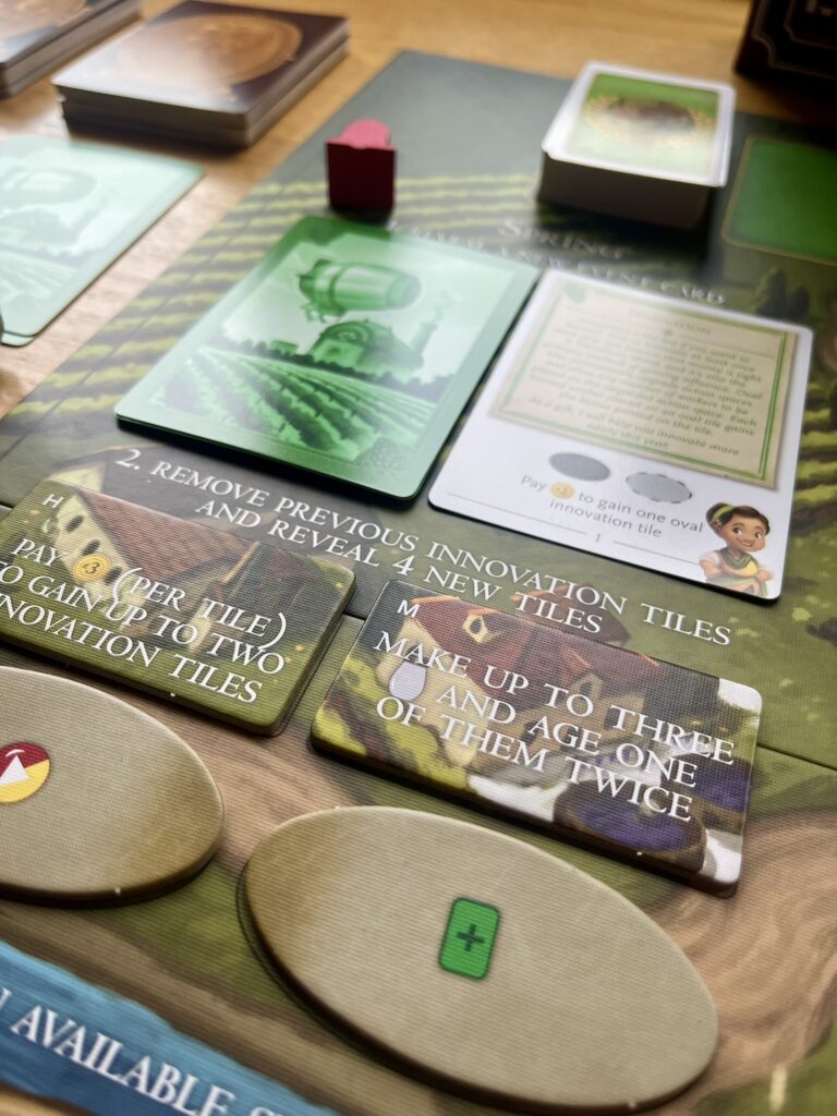 The new board features many familiar action spaces such as planting and harvesting fields, making wine and building new structures for your vineyard. Unlike in the core game there are no placement spots with bonuses. Viticulture World also offers some new actions such as the powerful innovate action. Innovating allows you to place innovation tiles to overlay and upgrade actions on the board, for example the harvest action might be upgraded from harvesting a single field to harvesting all your fields or you may be able to play two visitor cards at once rather than a single one. There are also oval innovation tiles which upgrade the action slot themselves to include a bonus and unlimited capacity for workers, however the bonus can only be claimed by hatless trained workers. There are four innovation tiles available each game year, however due to the expense of the action players can likely only afford one or two tiles so careful consideration is essential.
