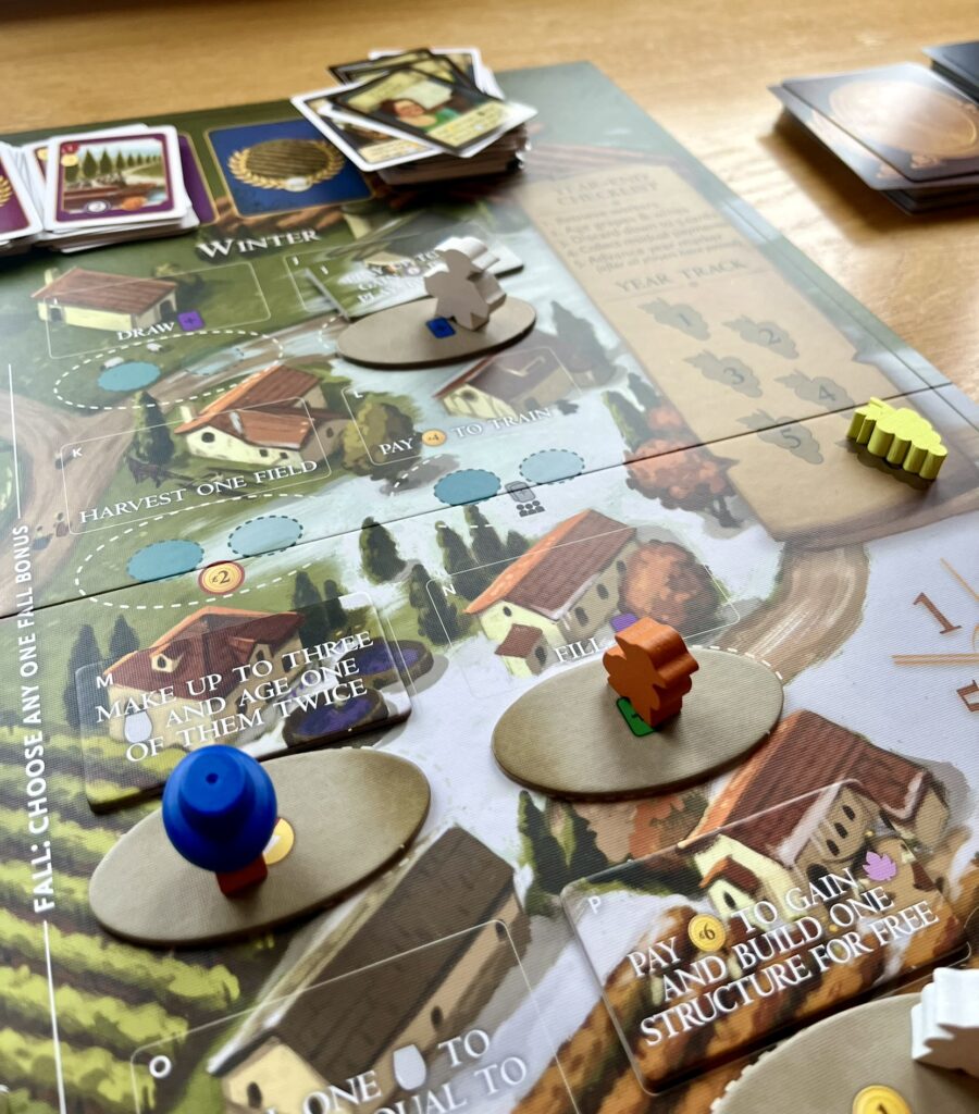 Much of the core gameplay remains the same but there are of course some new additions. With the exception of the grande worker and the ever popular grey temporary worker workers are now seasonal as denoted by charming little yellow or blue hats meaning they can only be placed on actions in their associated season. Rather than gaining new workers, workers are now trained and their hats are ceremonially removed allowing them to be placed in all seasons bringing much needed flexibility. Placing the grande worker on an already occupied spot now allows players to trade, you might give a fellow player a coin or two so they can build that much needed cellar and in exchange they might offer you a white grape so you can finally get that lucrative champagne order filled.