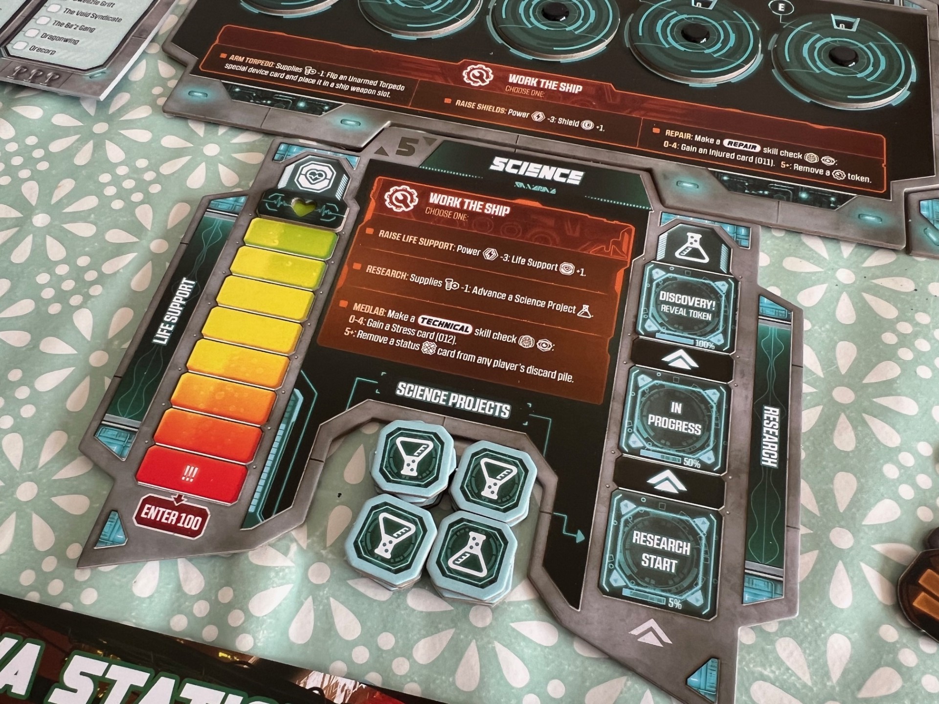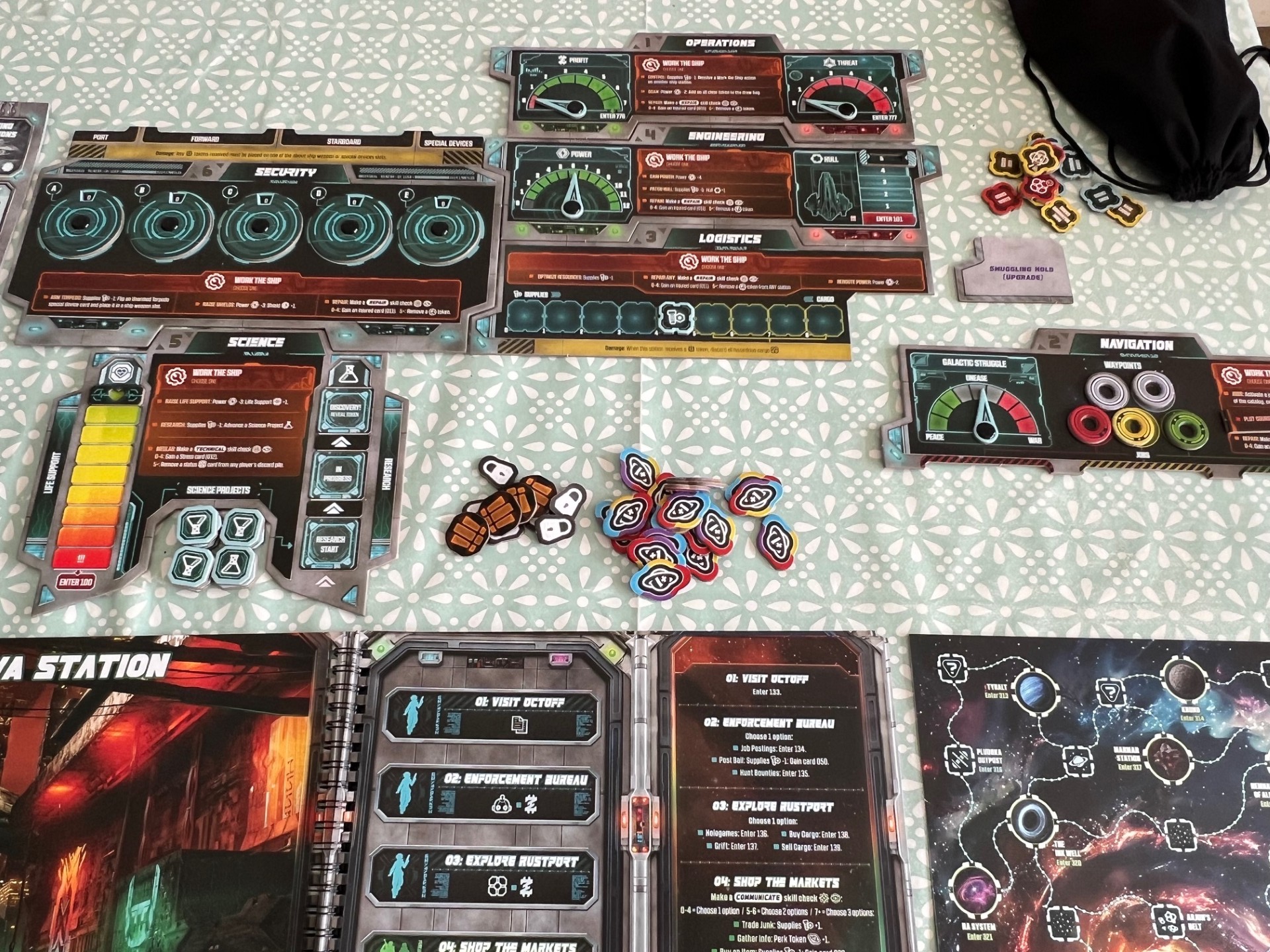 Other components include a character sheet for each player and one for the ship that the players will obtain relatively early in the game. There are also ship stations for security, science, cargo and a few others, each of which must be assigned to a player at the beginning of your session. I’ll admit that because I play most of my games with our kids, I end up with quite a lot of admin as a result of this — simply because you can’t rely on kids to manage these stations as the game expects you to.