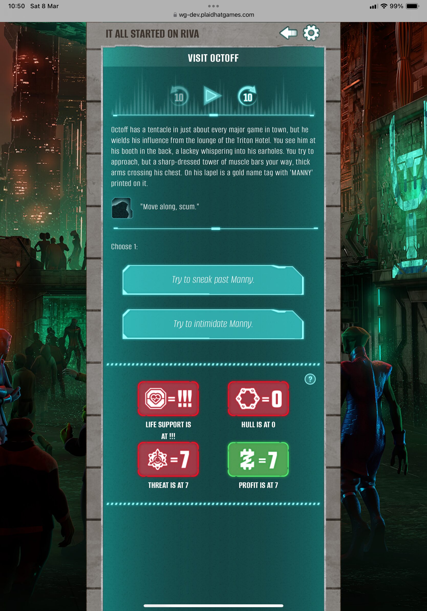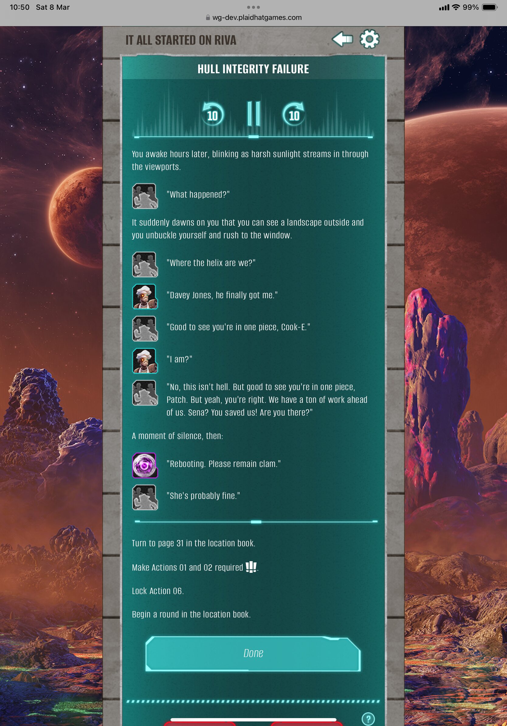 In most cases, the outcome will vary depending on whether you were successful, or even how well you did (ie a critical success or failure). Sometimes, encounters like this will spin the story off in very different directions, whilst on other occasions the outcome will be less impactful. In most cases, the tests affect the dashboards in some way, and so there’s a tangible link between what happens in the app, what happens on the location board and what happens to the ship (on which everyone lives).