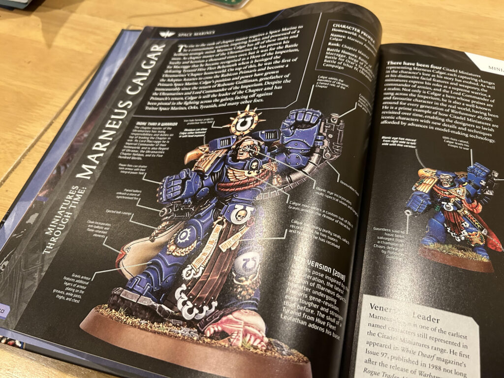 Something I was not prepared for and which was wholly welcomed, was a section here and there dedicated to certain models in a display of how they’ve progressed in scale alongside the growth of the tabletop game. I’ll highlight one in particular, that being Marneus Calgar of the Ultramarines. Personally, I’m not the biggest fan of the faction (Yes, even after the fantastic Space Marine 2) but I still found it thoroughly interesting to read about how his model has adapted and changed over the years.