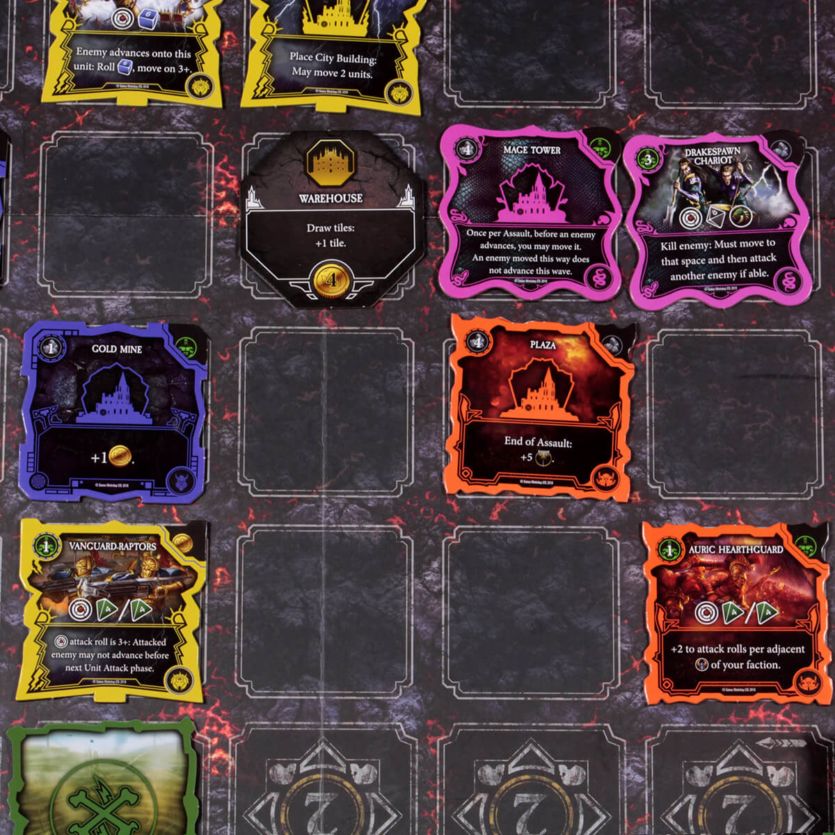When an assault happens, the players will collectively fight to defend Anvalor based on the units and buildings that have been placed, which will face off against the enemy units that are now flipped face up (only in spaces where the assault has triggered.) These enemies can then be attacked by all adjacent player units, resolved in order of the arrows shown on the board.