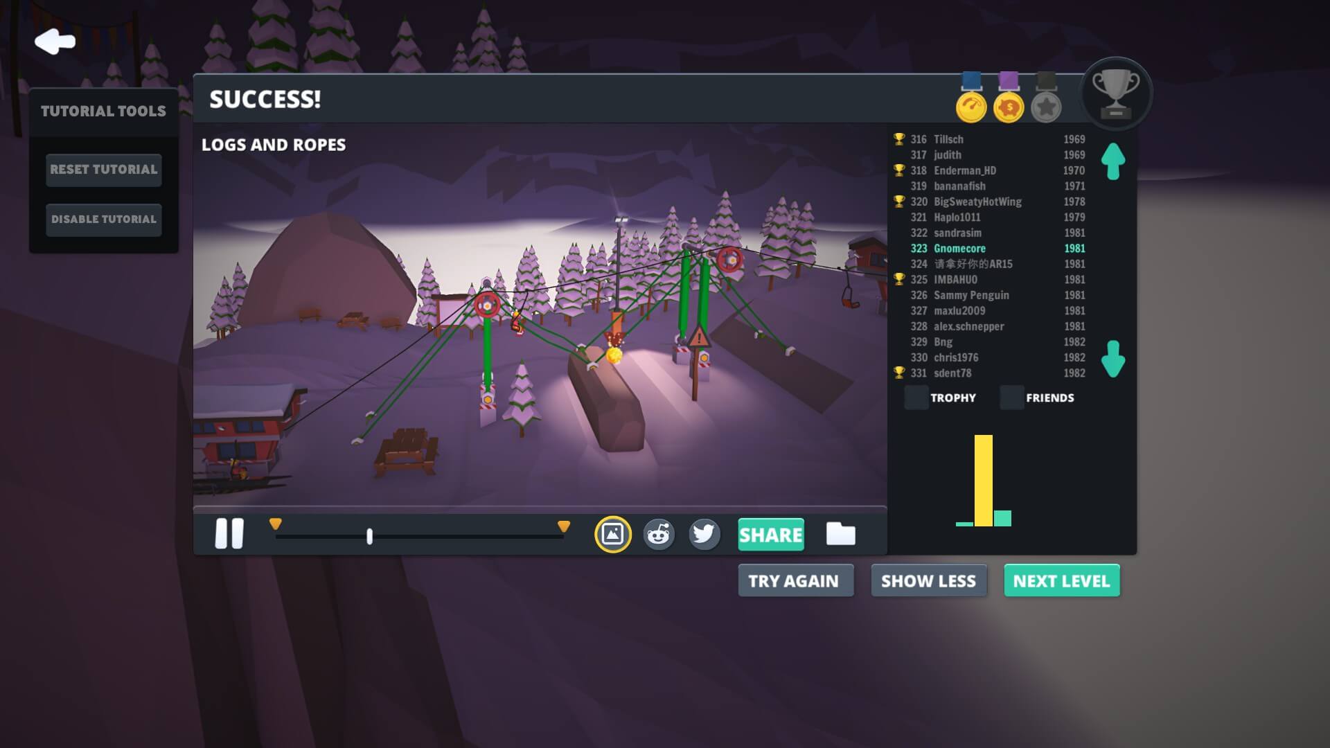 Directly after the tutorial, I already found myself trying over and over to get the structure right (and trying to get as few fatalities as possible…). That may be because I’m a bit of a perfectionist, but it was still very enjoyable and made me think hard about how to solve the problems I have, whilst still being fun and not overly difficult.