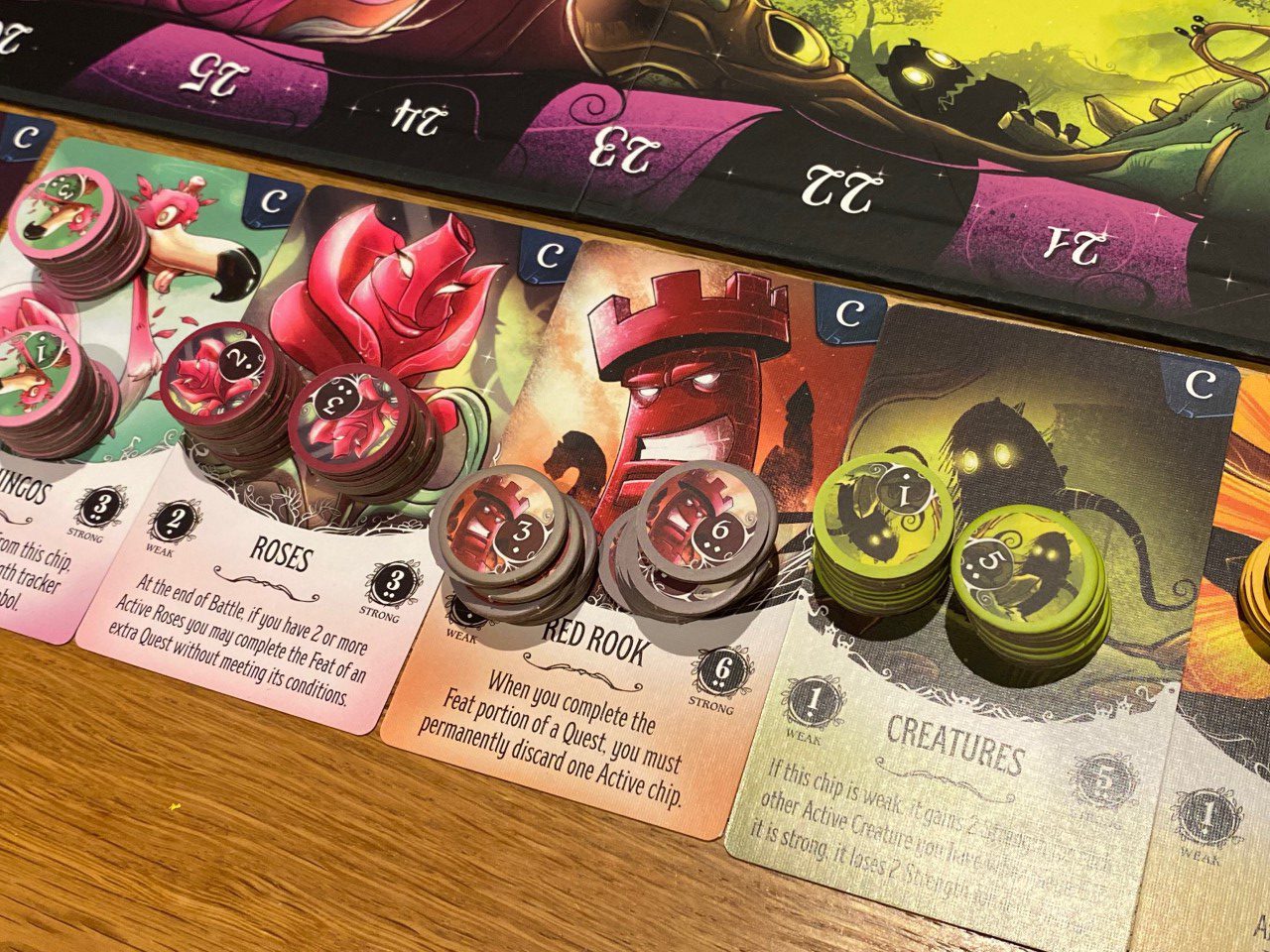 When everyone stops drawing chips (and assuming anyone who bust has already skulked off to lick their wounds) the score is determined. There is always a score for winning the battle in a region, but there may also be points scored here for quest cards —for example just participating, or because you ended the battle with an odd number of strength. Any points scored in this way are added to the board and then the next battle is resolved. In three to five player games, the players who are not competing in the battle can wager on each of the combatants, ensuring that everyone stays in the game at all times.