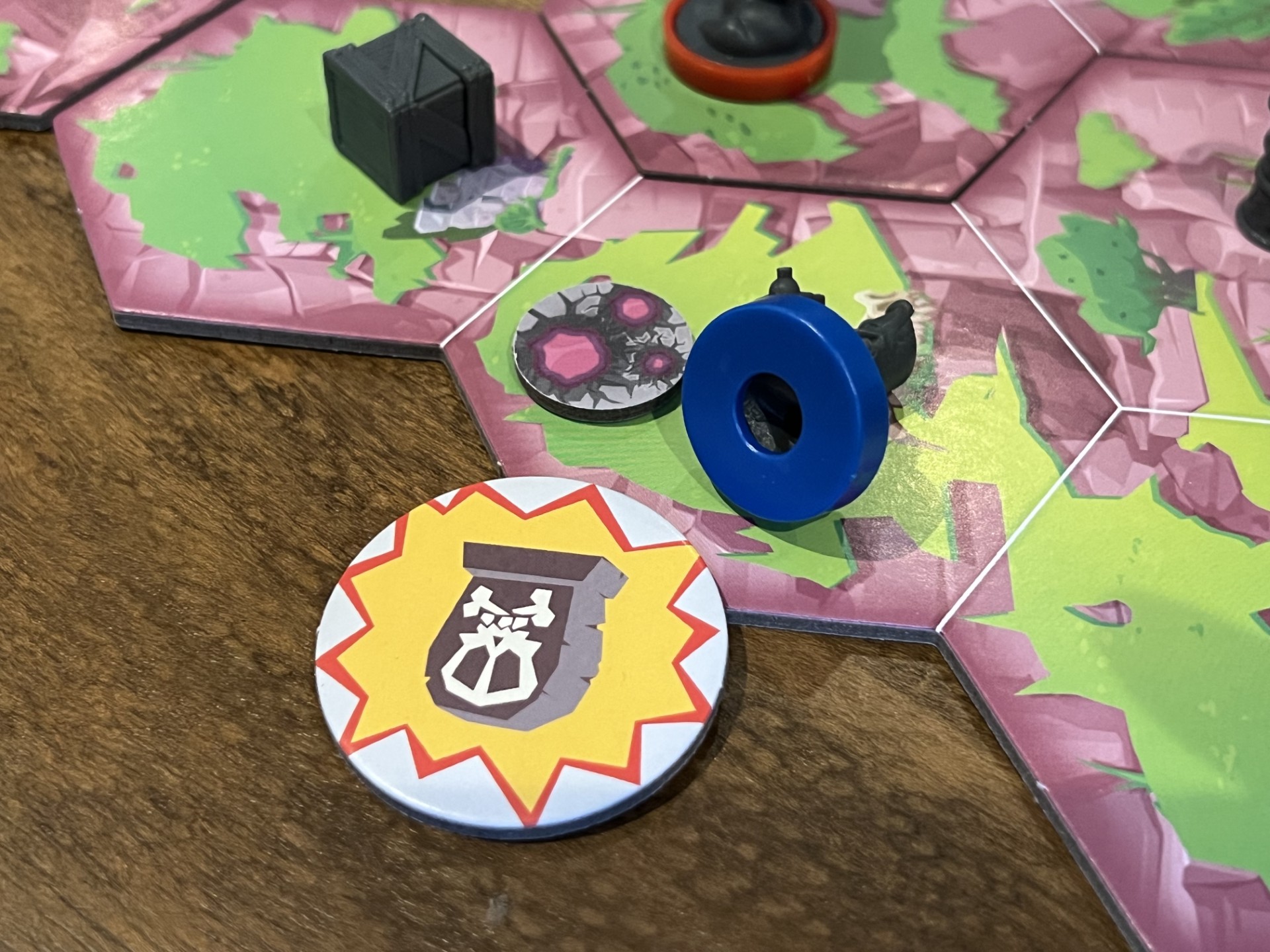 Now, because Worms: The Board Game takes place on a flat board that builds outwards across hexes, one of the most important features in Worms could have been missed. That feature is the erosion of terrain as it takes damage, but again, Worms: The Board Game has a clever and simple solution. As explosions occur in hexes, crater tokens are added – accrue enough of these and the landmass will slip into the sea (and be replaced by a sea hex.) Can you remember what happens to worms that fall into the sea? Yeah, same thing in Worms: The Board Game.