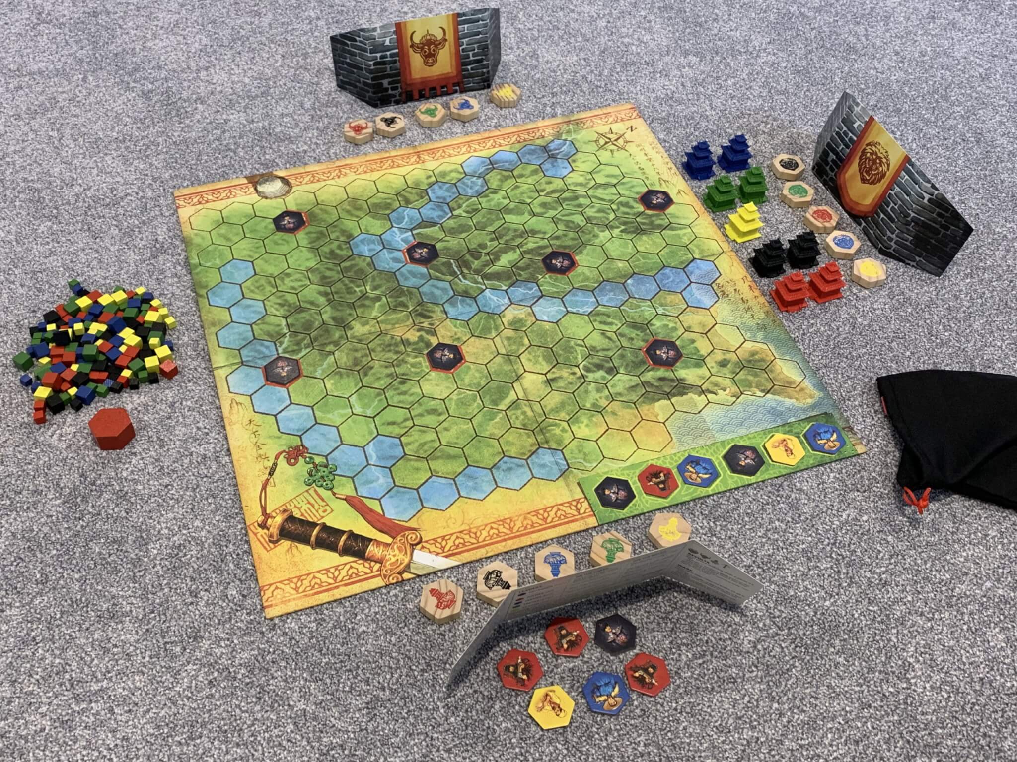 The board will be set up to include a number of starting states, each of which will be represented by a single governor (black) tile. The players will draw a hand of six tiles from the bag, which will be kept secret behind their screen — their leader chips will usually be placed in front of the screen for all to see, except when they are put onto the actual board.