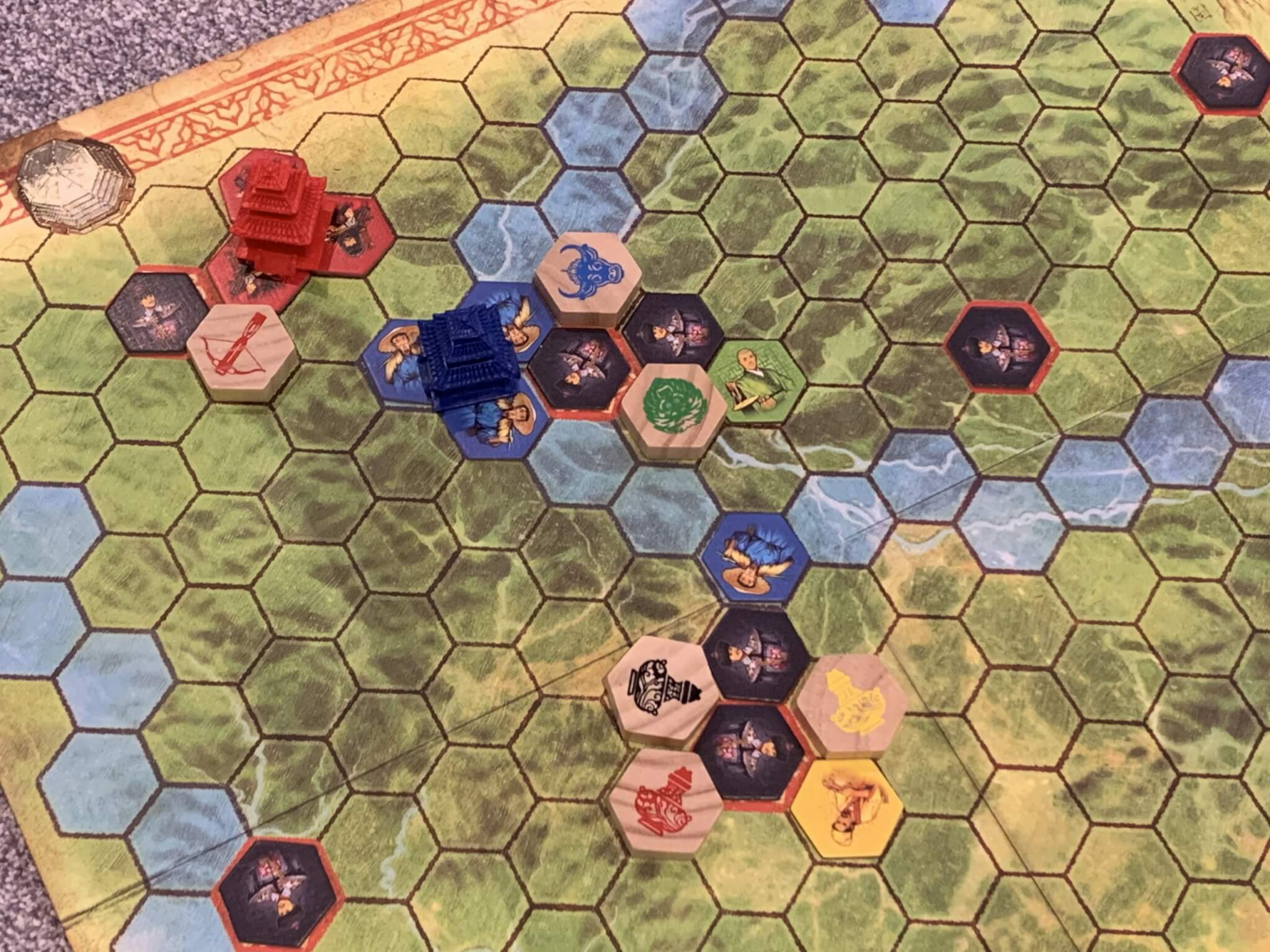 During gameplay, players will score points for placing tiles of matching colours into states that their leaders are attached to. Place a blue (farmer) hexagon into a state where your blue leader is and you score, it’s that simple. When three matching hexagons sit together in a triangle shape, a pagoda can be formed, and whichever leader controls it will score one point per turn in that colour.