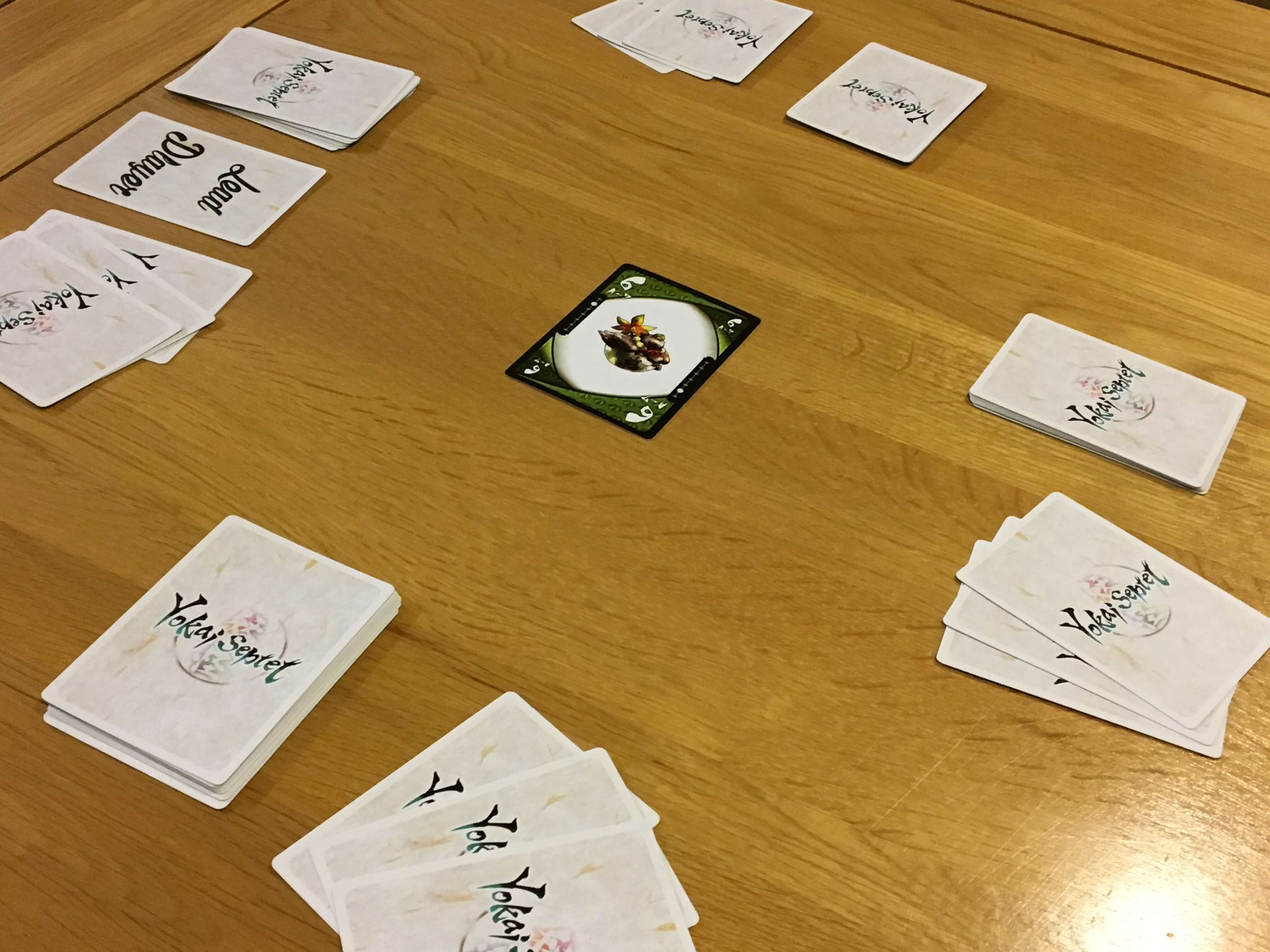 The aim of Yokai Septet in its default variant is to either win seven hands between a team or two (or five in the three player variant) or to control four of the seven Yokai Boss cards by winning them in tricks. Boss cards are marked — you guessed it — by the number seven, but not all suits feature the same run of numbers, so as the round progresses and players are less able to either follow suit or to trump, higher numbers can still win the day.