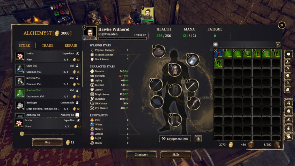 It’s not all great though, there’s clearly a lot of nostalgia for older games behind this, specifically aRPGs (even if the game is not an aRPG) and that’s evidenced by the sheer amount of dead space you’ll be re-treading as you work your way out of a dungeon or back across the map. I know that I have a short attention span, but quicker travel or transitions are becoming increasingly standard in games these days. Some UI elements and mechanics are simply not explained either, I was speaking to a friend about Zoria: Age of Shattering, and neither of us could remember ever having how to learn recipes explained to us. Similarly, shopping and trading can be very arduous, and while the game has a fantastic crafting system and a massive scope of magical and ‘named’ gear, it’s unwieldly to manage and really cries out for a better comparison (or even auto-best) system.