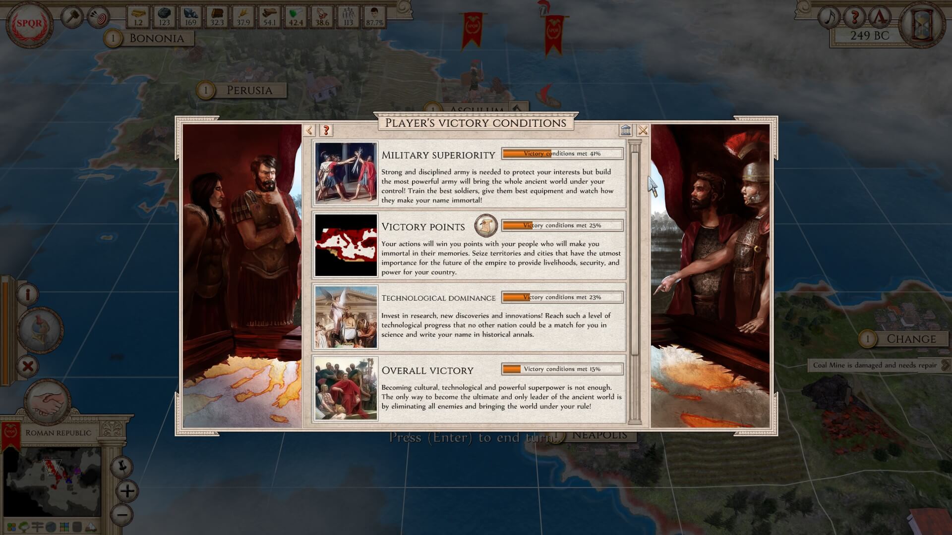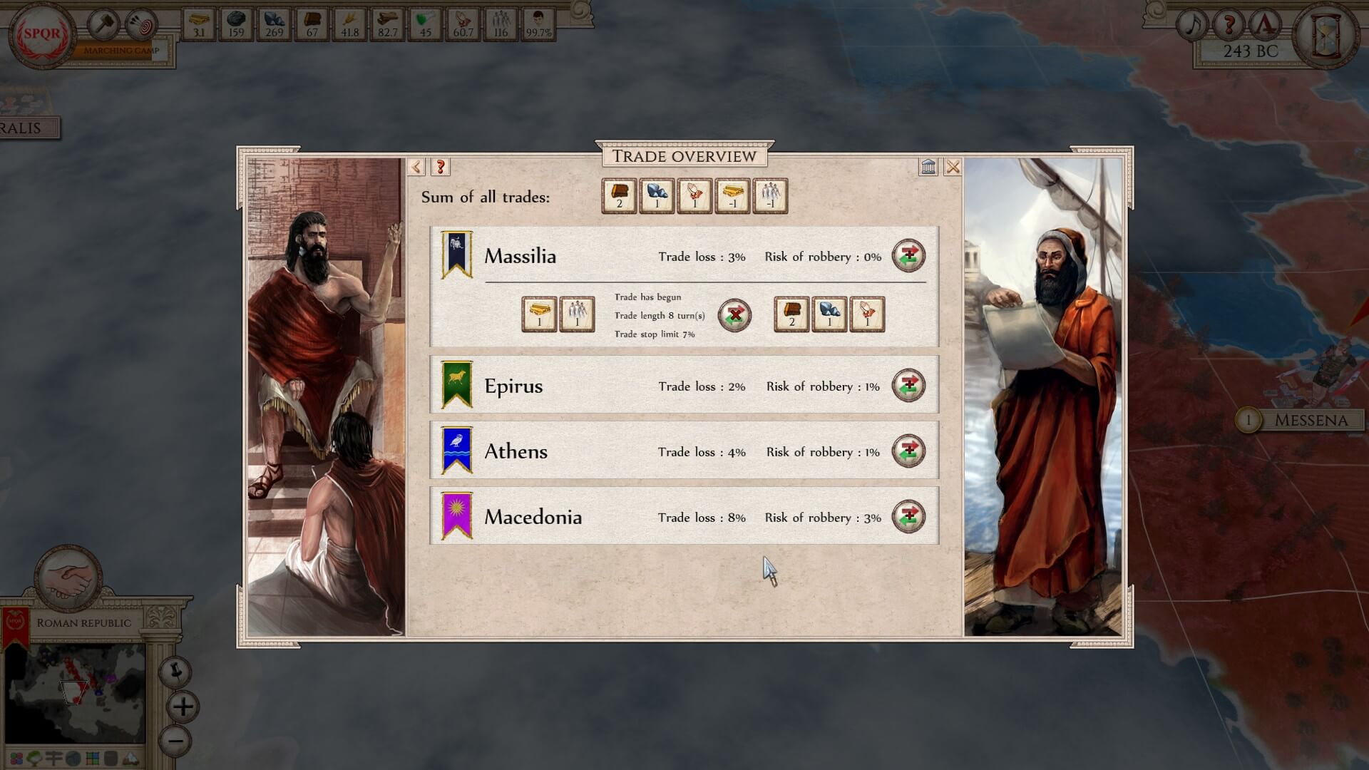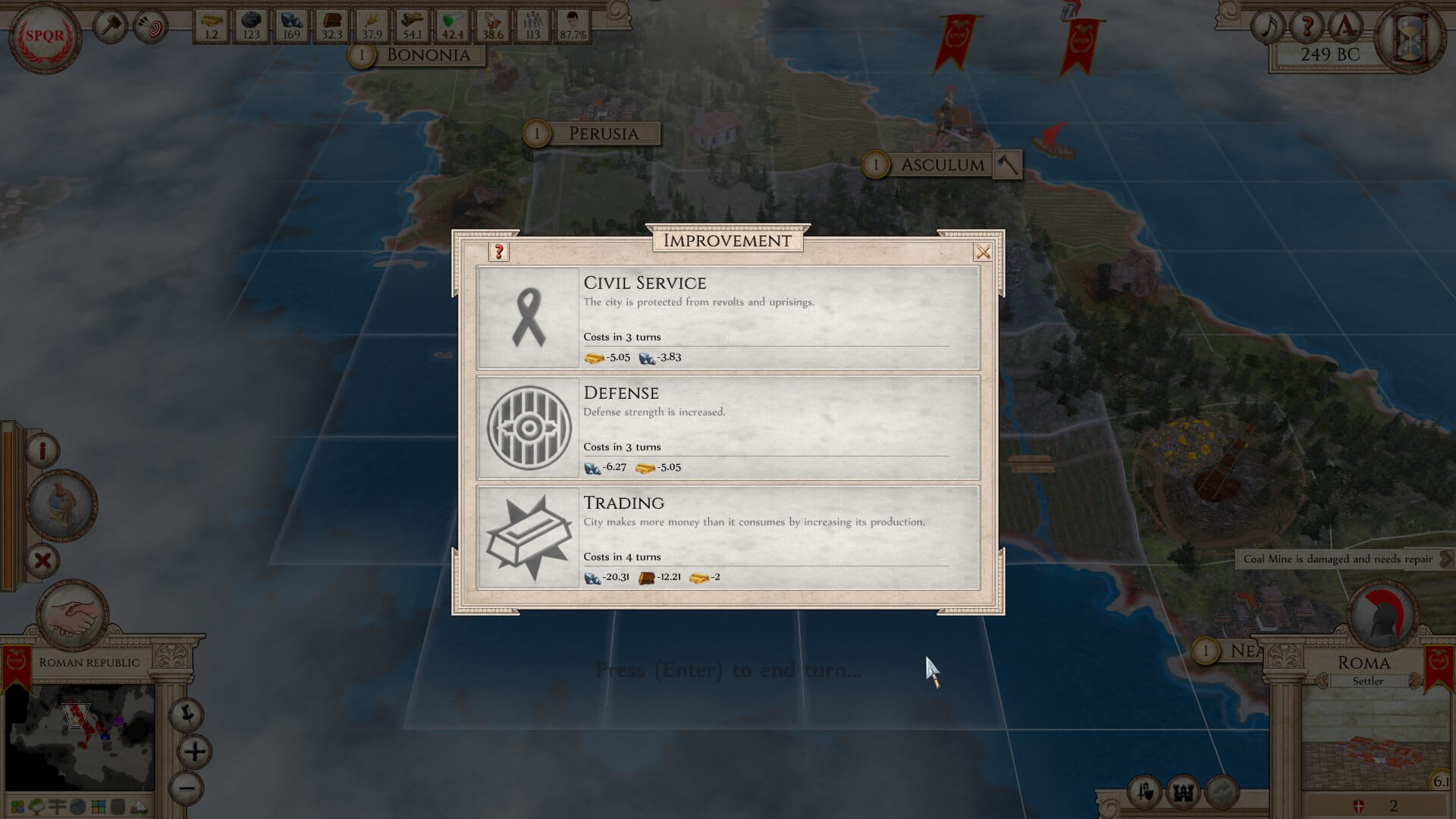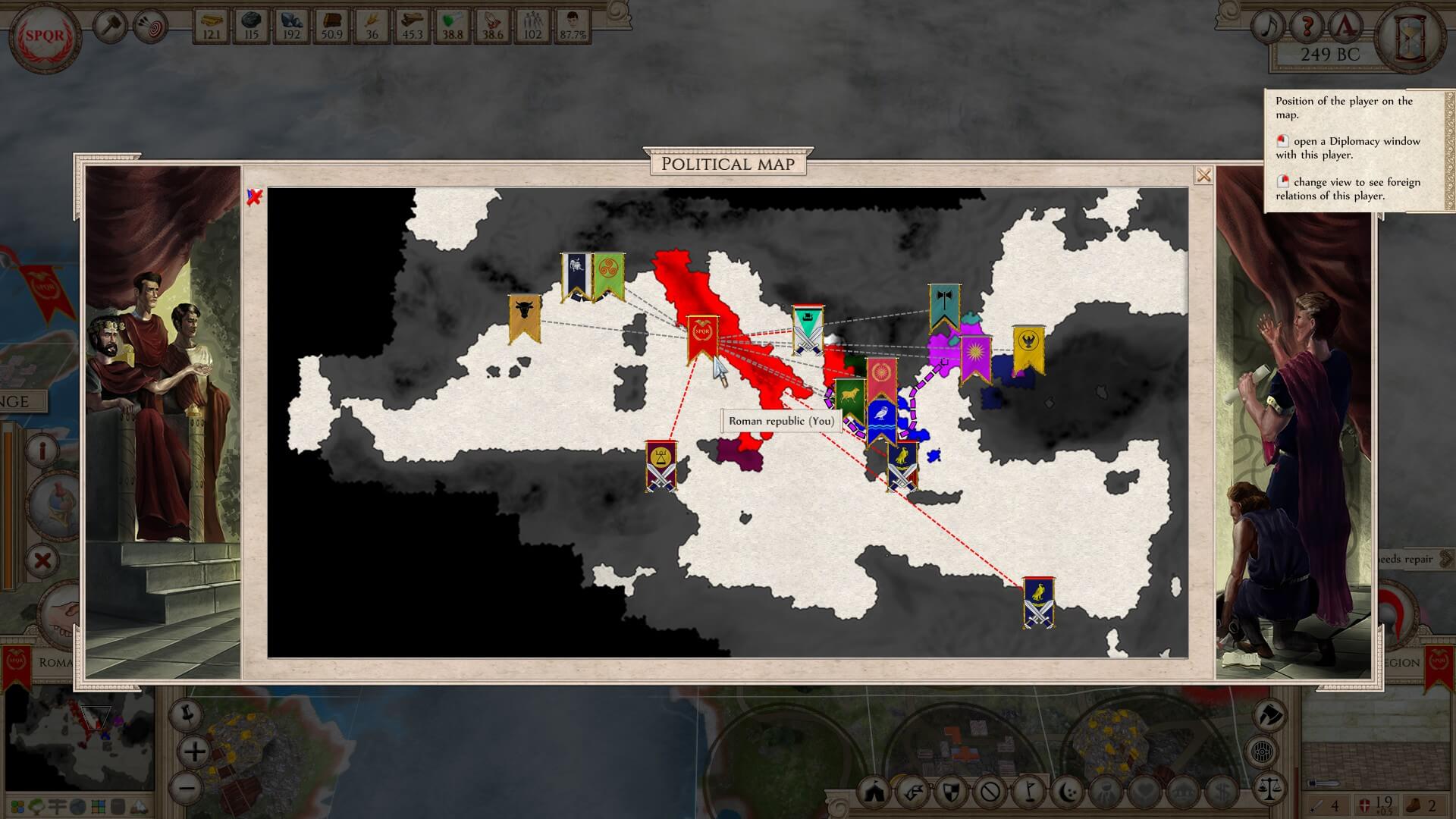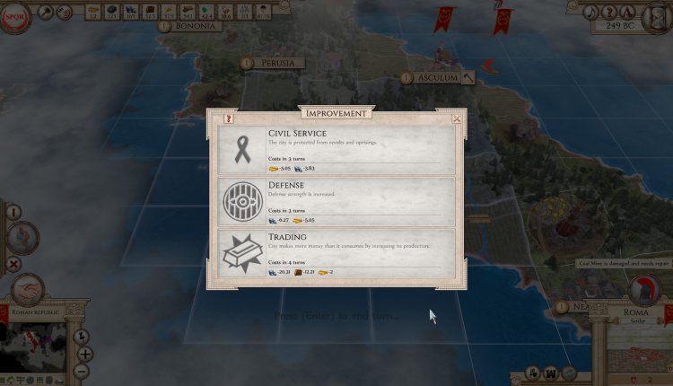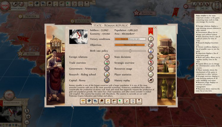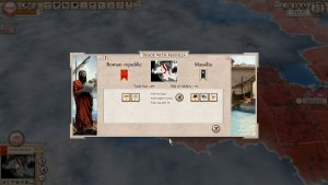 Trading is only a tiny part of the complex government machine of which you’re in charge. There are eleven kinds of bilateral agreements, covering everything from map sharing, supply support and defensive pacts, to making Confederations and absorbing their entire country. There are limitless combinations you can do with trade and diplomacy. State decisions also pop up occasionally and when the right circumstances are activated. Obviously, these affect the entire country and are not to be taken lightly. As with all of the balance of Aggressors: Ancient Rome, there are pros and cons for each.