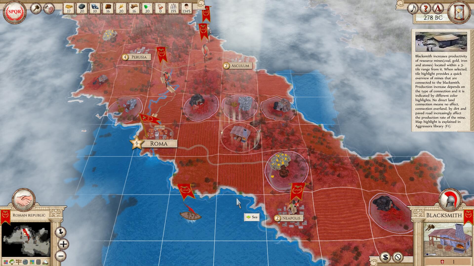 One of the most intriguing and fascinating (okay, it’s just downright cool) aspects of Aggressors: Ancient Rome is the ability to place buildings outside of the cities — that affect a certain area. Placement of these is crucial to influence as many pieces as possible. For example, a blacksmith enhances any nearby mines that are within its zone; a temple influences cities, etc. Then, there are some standalone buildings for production — a stable for mounted units, a shipyard for, well, shipbuilding, etc. It’s just such a different mechanic than most games in which you’re always building things within each city. Again, I just love this facet.