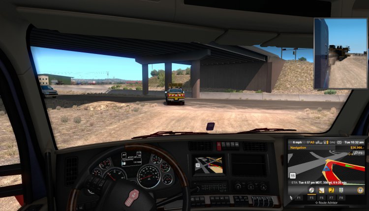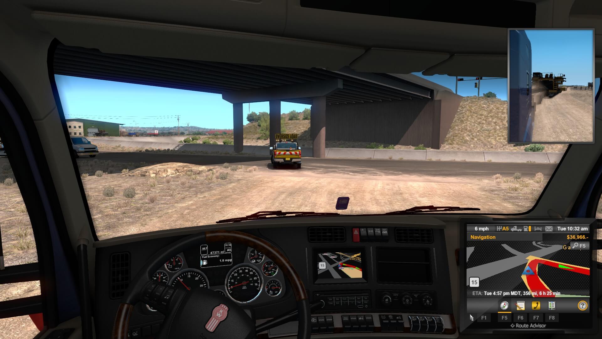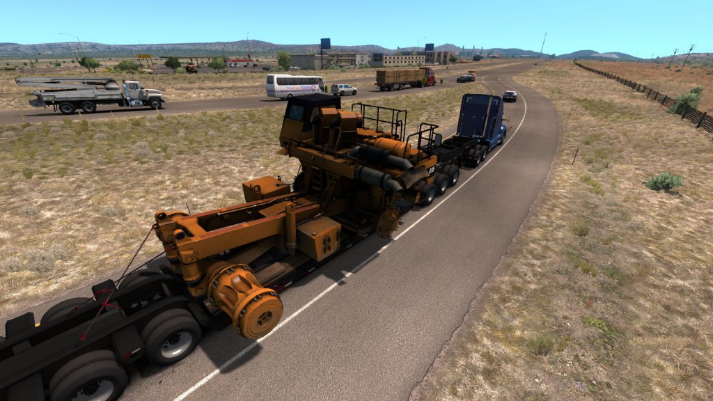 Since you can only get Special Transport missions from certain cities — of course, I started in Albuquerque… which isn’t one of them. Gallup, New Mexico looked like the closest. I certainly wasn’t going to dead-head it over there, so I chose the heaviest load possible to get paid for a trip to Gallup. This isn’t Euro Truck Simulator 2 in which I have a monster of a truck and even a three-man crew running for me. I wanted to see if my (basically) starter truck could pull a heavy load, how it handled, how the weight affected it, etc.