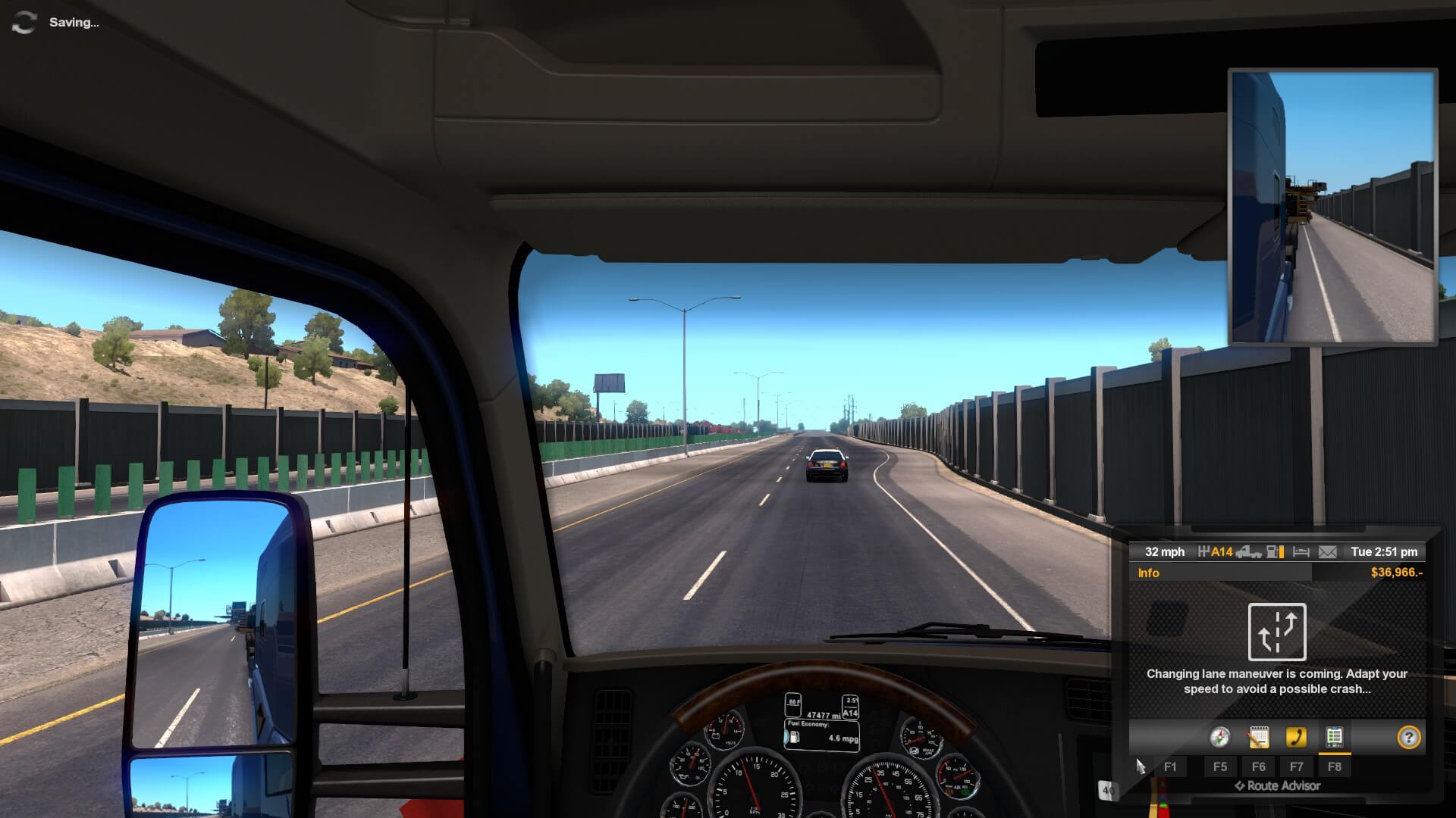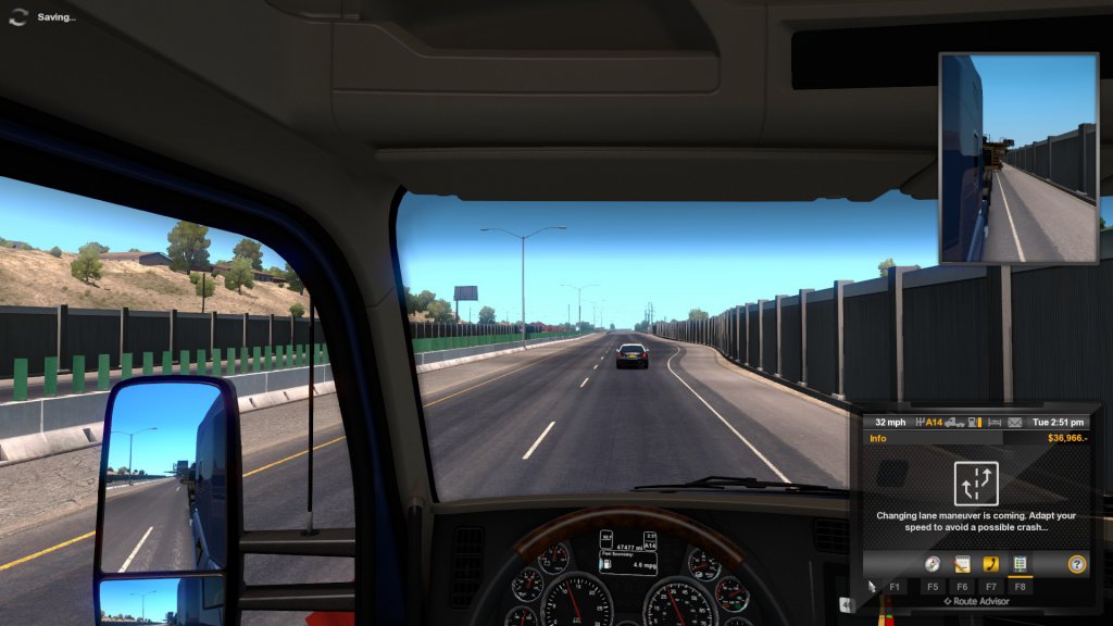 At one point, a red Mustang did, what I thought was, cut off my guide rather abruptly. My first thought was, “Crap, now we’re going to have to sit and wait while the highway patrolman gives the ‘Stang a ticket.”. Whew. Luckily not, he just let him go. If I would have done that in real life, they would have pulled the whole convoy over just to ticket me. My luck is boundless.