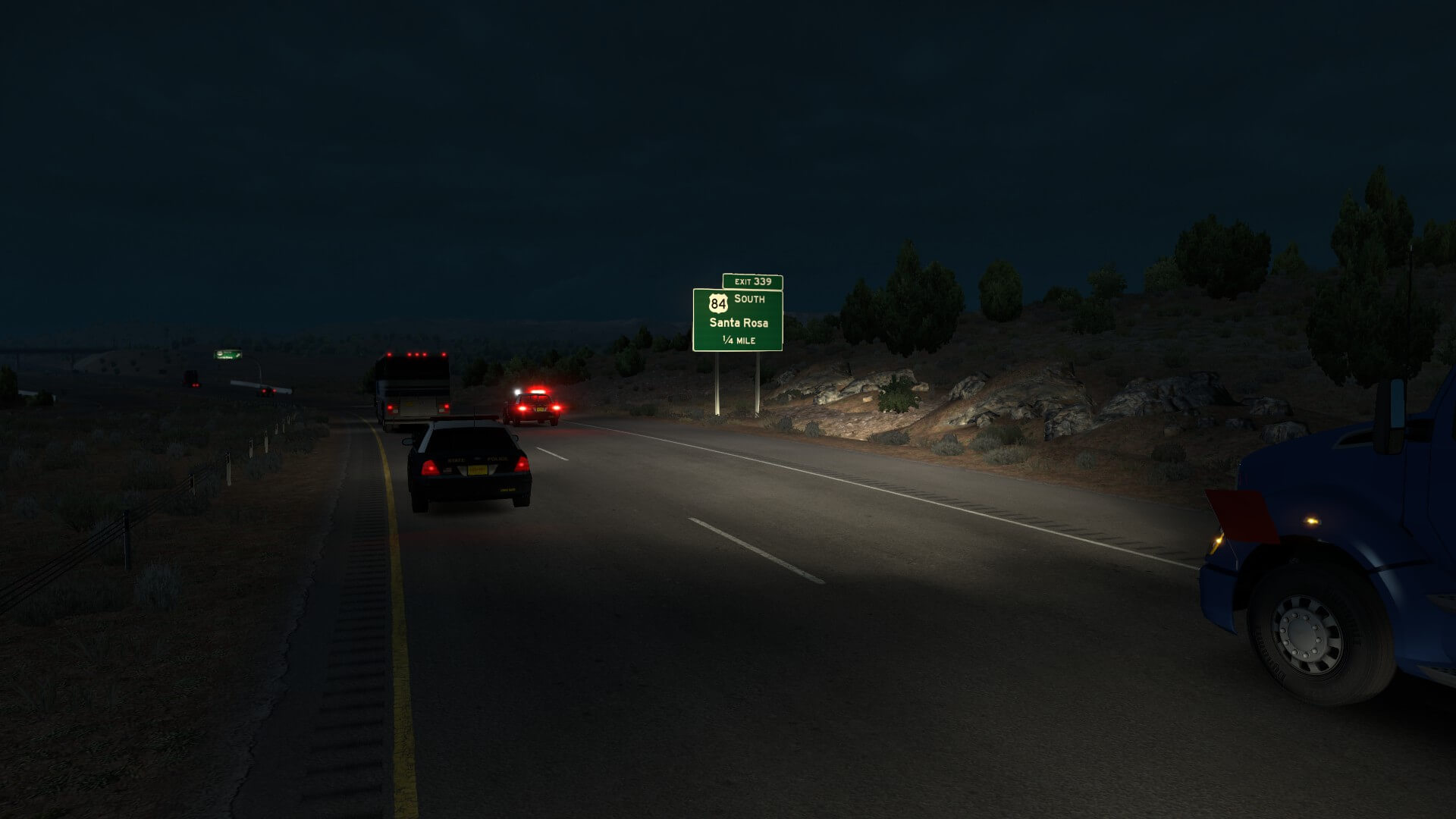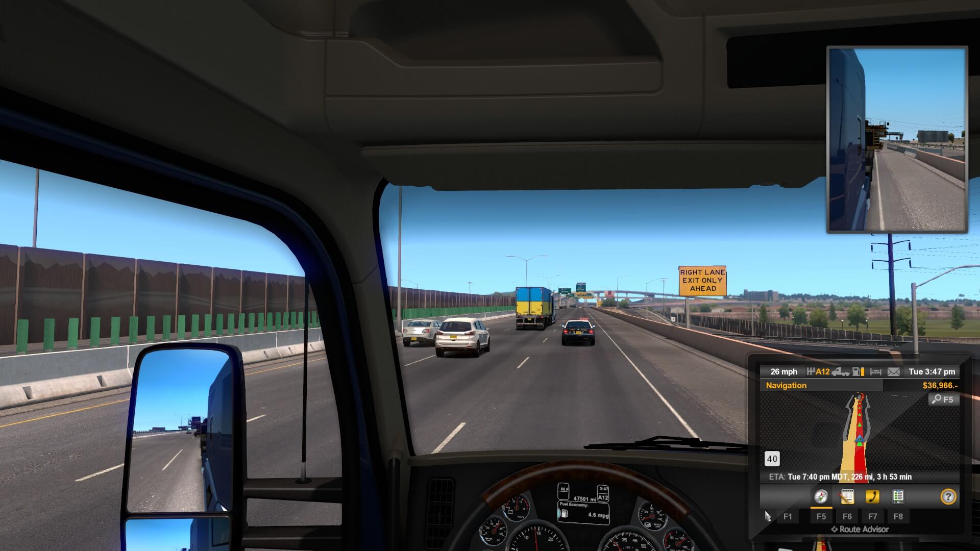 One of the coolest parts of this whole journey is having the escorts. As you saw in the screenshot, we don’t have to stop and always have the right-of-way. They even had all the traffic blocked so we could get onto the on-ramp, hassle and traffic-free. To be more clear, not only were the local vehicles stopped, they had the highway shut down, just for my haul! Then, I peed out of both excitement and entitlement.
