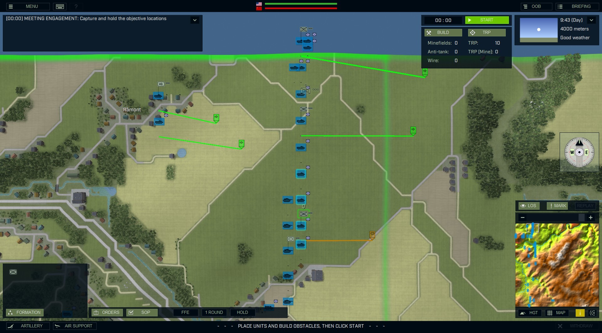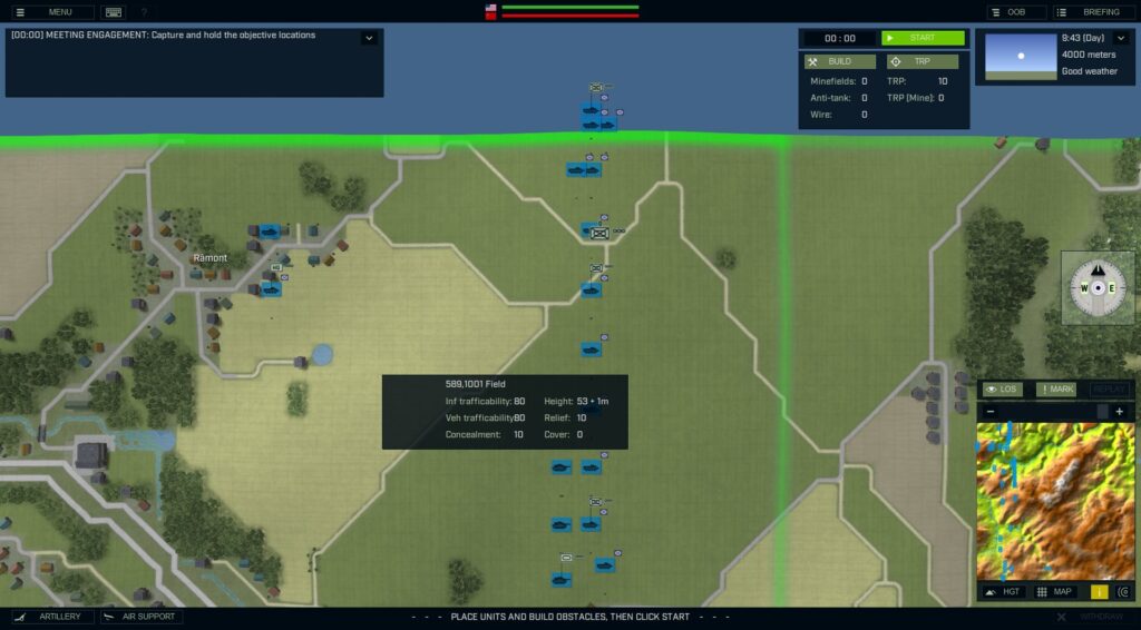 The force(s) placements on the board are done by the computer. HOWEVER, before even hitting the “Start” button, you can move you units at will, to (almost) anywhere you want them to setup and start the campaign. “Almost” because the battlefield has some vertical lines on it: one green, which you have to keep your troops west of; and another red line in which the enemy has to setup his units east of.