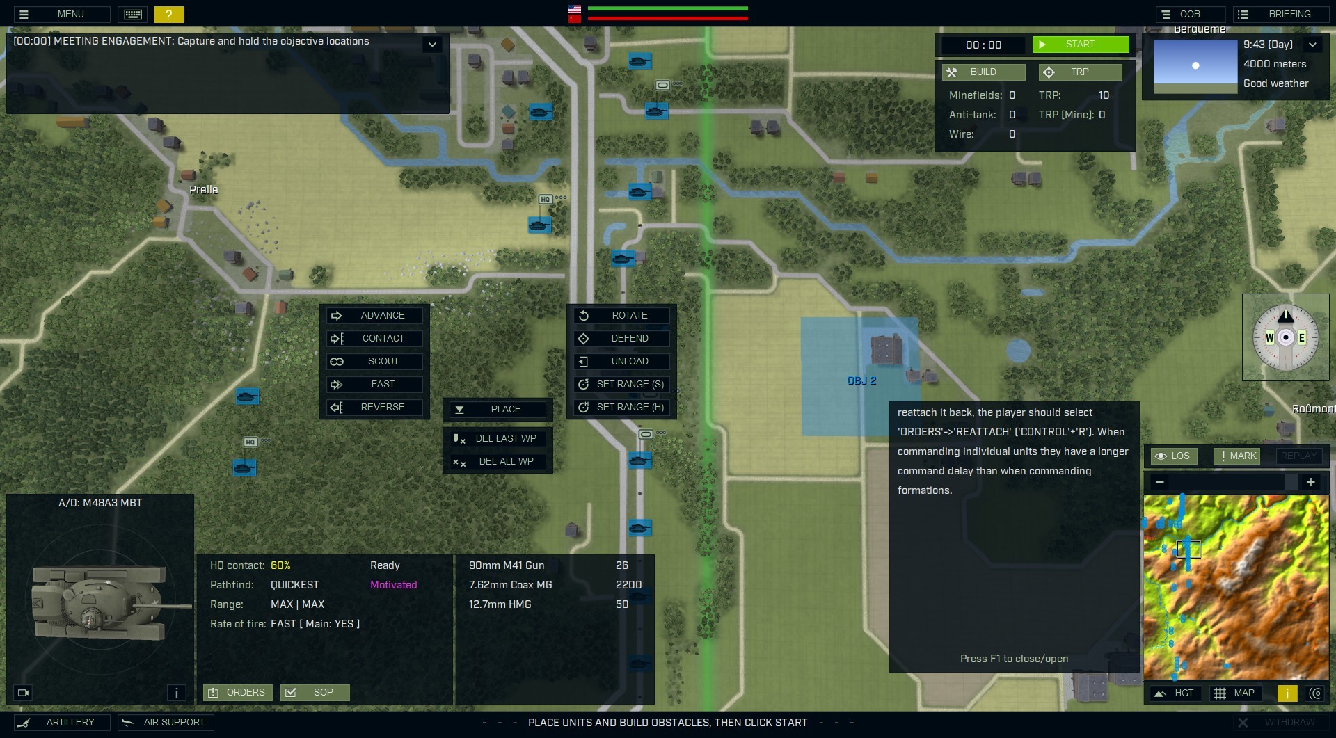 Pro Tip = Sometimes, the computer, during the setup phase, will accidentally put units, of either team, over their respective lines. Obviously, you can’t do anything with the ‘bad guys’, but you can move your own. (My campaign is Americans on the west, Germans on the right). Another huge “however”, (unless it’s a recon unit [which pretty much have the Rule of the Land before game’s start) if you see, then want to move a non-recon unit away from being ‘over the line’… if you pick it up, you cannot return it! It now has to go before whatever color your vertical/setup line is.