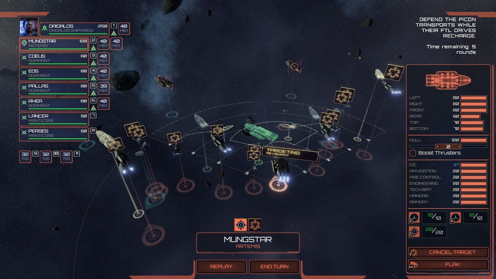We learned that the Twelve Colonies had developed a small but heavy artillery, firepower-amped Assault Carrier. One which carries a squadron as well. Also, as a result of their research, they managed to construct an extremely tough, heavily-plated Heavy Cruiser. Unfortunately for the Colonial fleet, the Cylons were developing their own countermeasures with a very threatening Tech Cruiser which can both hack Colonial ships, as well as perform small FTL jumps — during a battle, no less! As to not be out-gunned by Colonial Vipers, they also built agile and powerful Defensive Gunships. Both sides also expanded into the world of producing explosive mines: Proximity ones for the Colonial Fleet and Homing-Cluster ones for the Cylons.