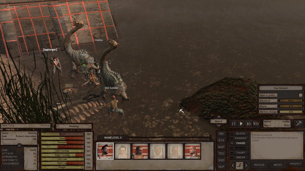 We stripped the crane creatures of leather, sold it for profit and used it to finish building up the facilities, soon people were on their feet and I started automating feeding the farms with the wells. Then my traders got locked into combat. What was awesome was seeing the Old Soldier I mentioned earlier defending the weaker people. Unlike everyone else he was blocking, dodging, and knocking enemies out left-right-and-centre.