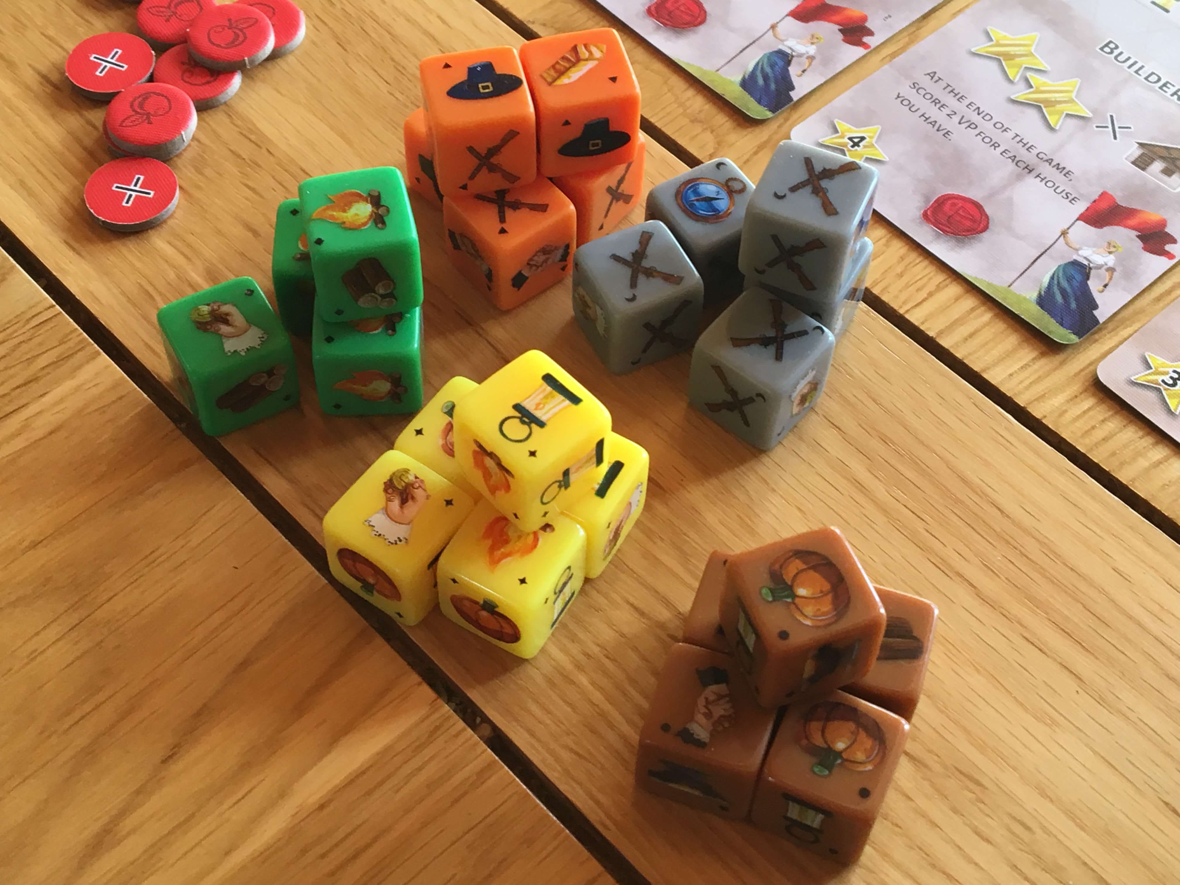 The resource tokens (of which there are plenty) and various other cardboard tokens (as well as the wooden houses) all look great. The real stars of the show are the dice, though, which I guess is what you would hope given the subject matter. There are numerous colours of dice (both basic ones and specific ones to match each resource) and each kind has subtly different printed faces. The main thing is that each die and every die face is clear and distinct, aiding in the speedy assessment of what you’ve rolled. It also helps that these are the kind of large, satisfying-to-roll dice that feel great to pull out of the bag and chuck around.
