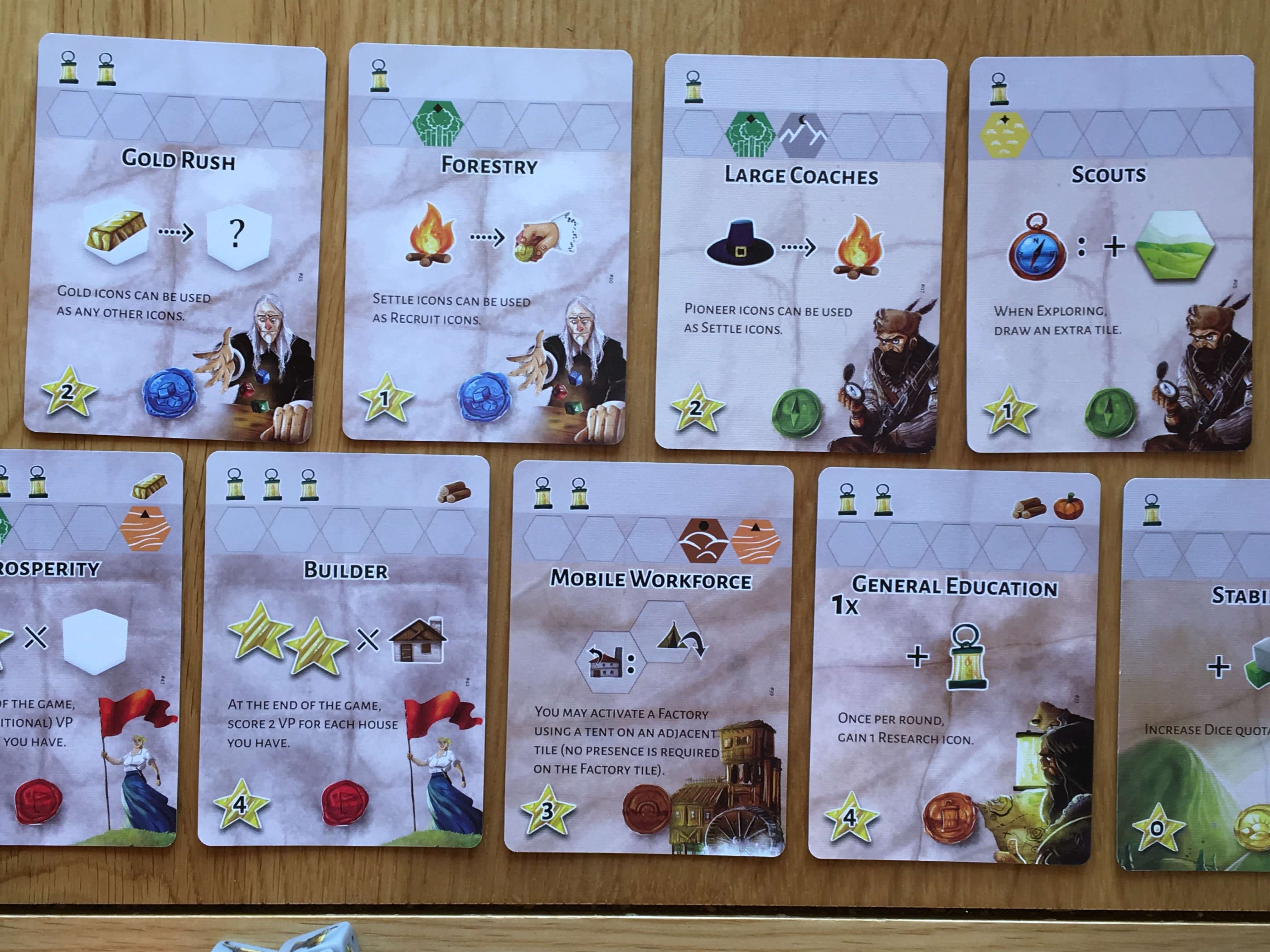 The final action is Research, which lets players spend a number of lamp symbols to place a tent on one of the Research cards — these usually confer benefits like a higher dice quota or similar. The game actually makes recommendations about different sets of technology cards to play with (including the starting set, which is what I’ve shown in the pictures). Whilst understated, technology has a huge impact on the outcome of Dice Settlers and must not be underestimated.  After all players have taken one, two or occasionally more actions, you all perform cleanup phase wherein you check endgame conditions, move dice to the spent pile and so on ahead of the next turn.