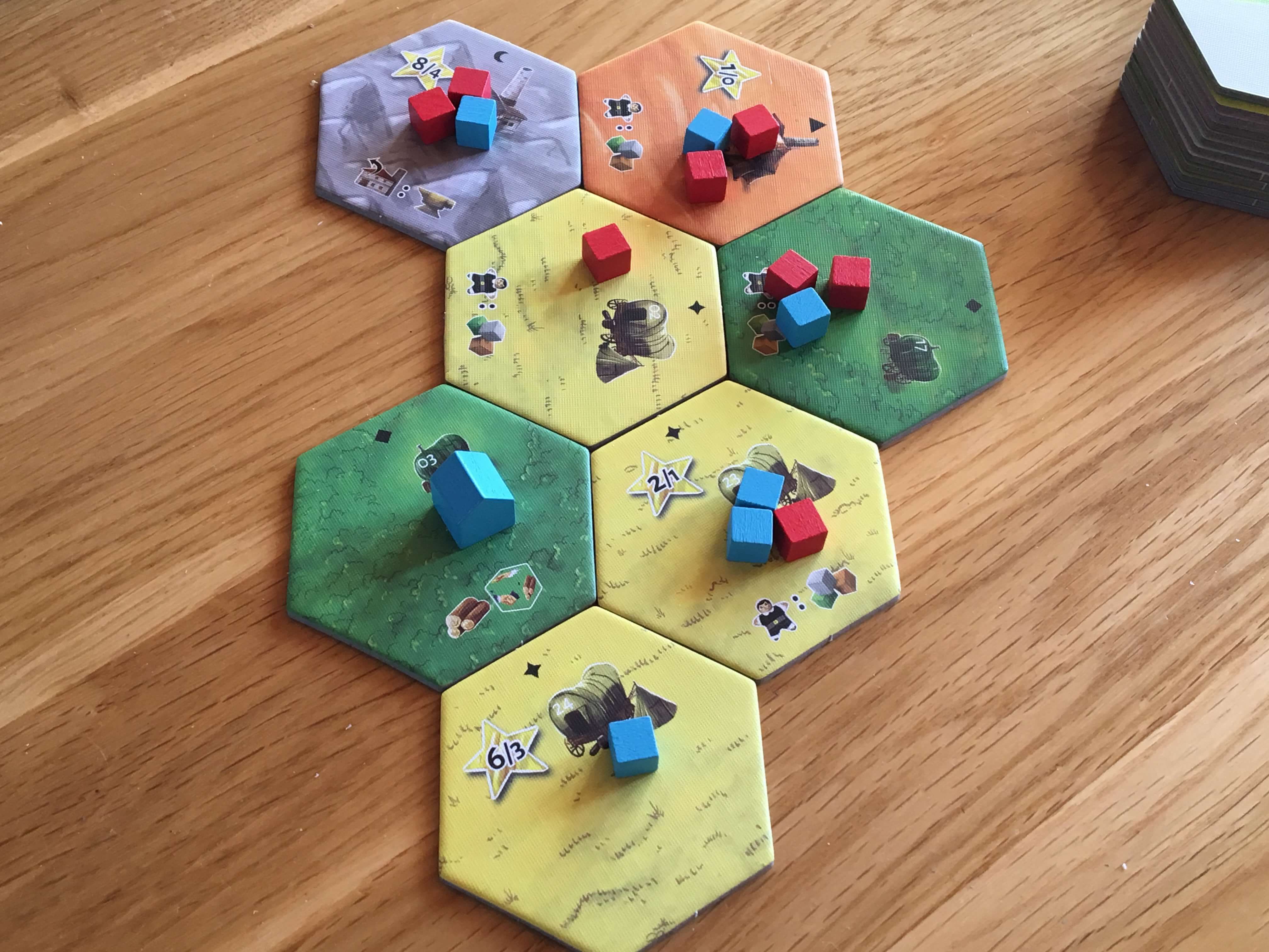 With that one gripe out of the way, more or less everything else in Dice Settlers could be described as very good overall. The board hexes are small but very clear both in terms of the type of terrain they feature (desert, mountain, grassy plains etc.) and the bonus they provide, which might be a resource or a new die, for example. Because the hexes are on the small side, Dice Settlers never takes up the amount of table space you might expect it to, but that’s actually a good thing for playing on a coffee or kitchen table. Unfortunately, where the hexes are small, the player boards are perhaps overly large, although that’s hardly a complaint.
