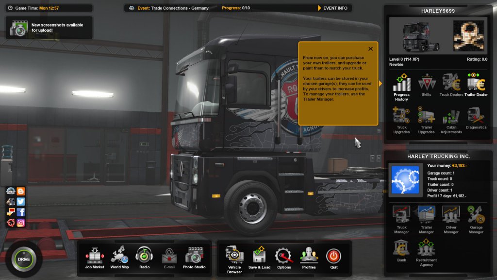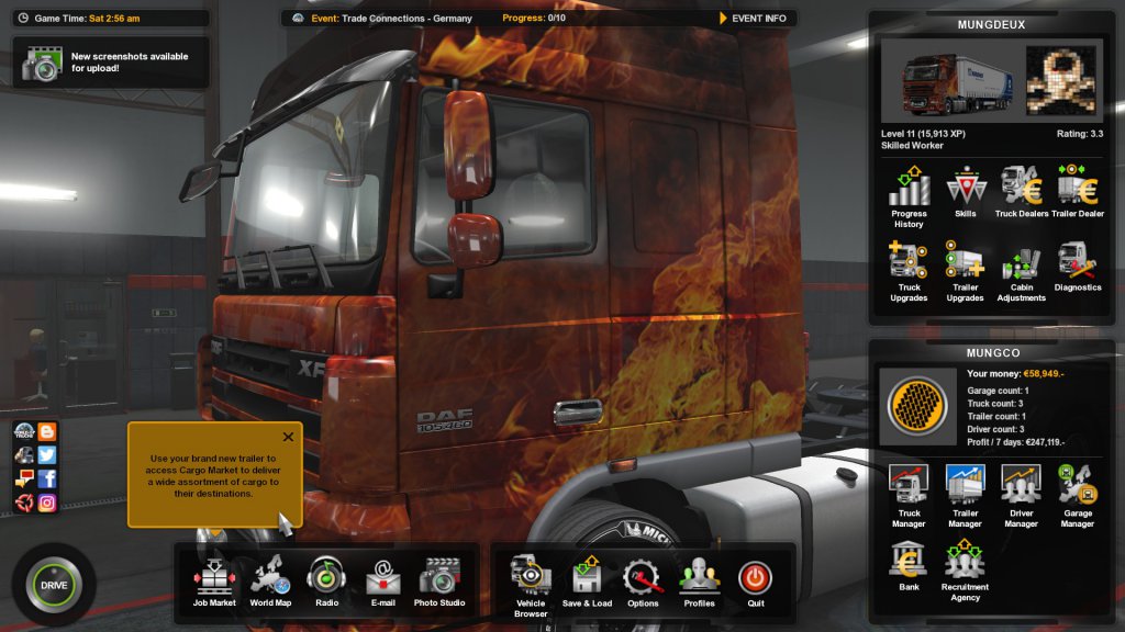 Now you can buy and manage your own trailers. When you take a job, provided you have the correct trailer, you can opt to use your own rather than one supplied by the company which has hired you for their contract. Just like the trucks, there are also many customization options as well. My goal is to eventually own all of the trailers, plus enough of them for my other drivers as well.