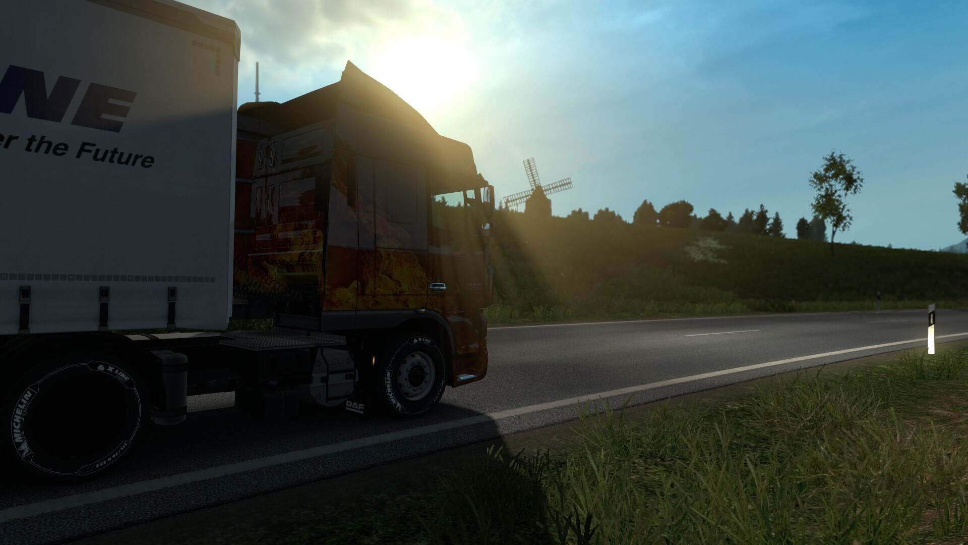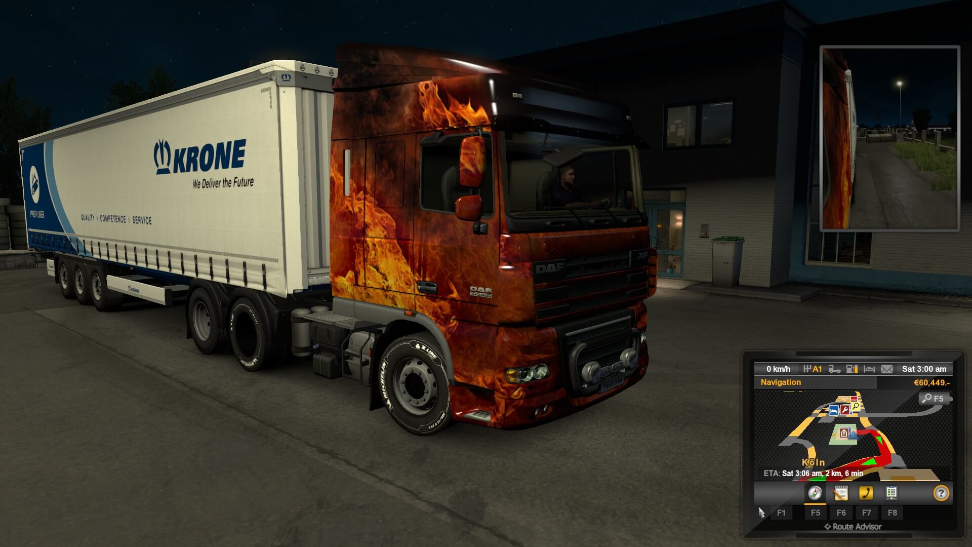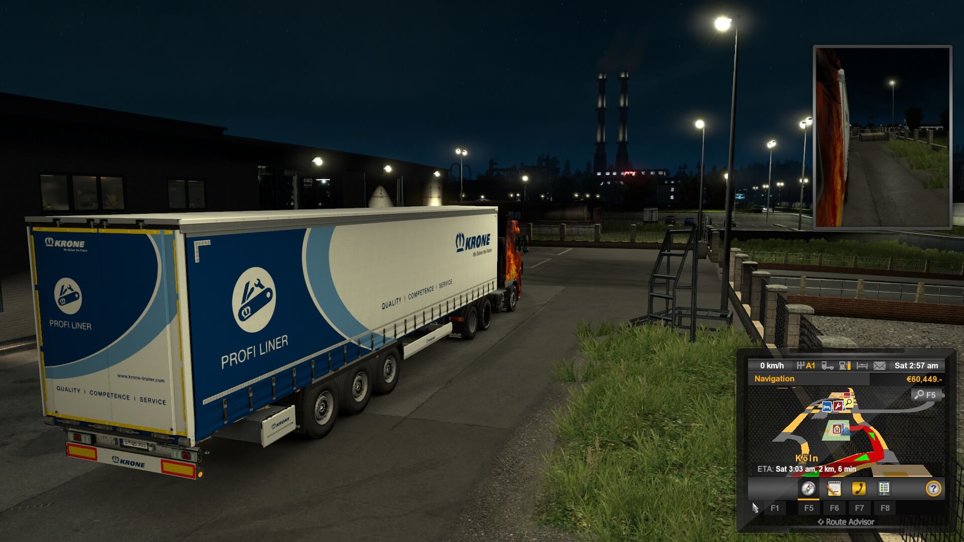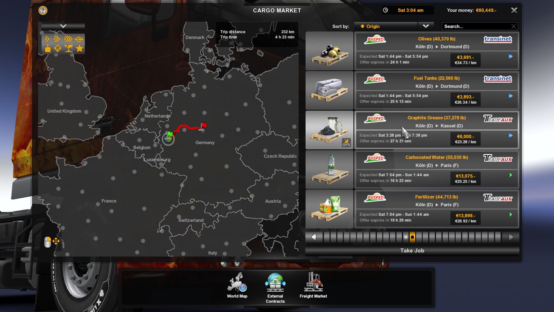 There were two, tiny, weenie runs I could have taken to test out my new addition, each about nine minutes. Nah, that’s not how I roll. Instead, I opted for a 232 km trip, hauling graphite grease, from my base in Köln to Kassel, Germany. I figured that about four and a half hours was enough time to get used to it. It’s not that I beat up or trash other people’s trailers in the slightest (I’ve never had more than two percent damage), however it did make me a liiiittle more aware of the extra 13.62 meters of metal behind me.