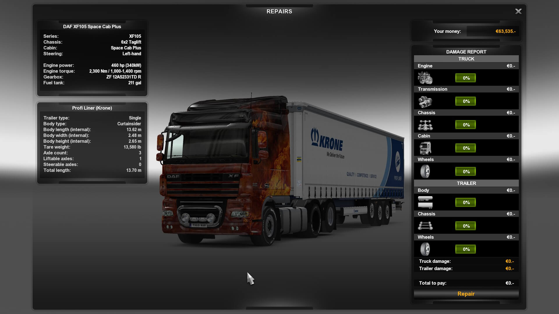 Luckily, I already had enough money to buy one when I received the Krone DLC. Of course, I had to buy the cheapest — a Profi Liner — which is a good start. It’s a three-axle (one liftable) curtainsider that can carry ‘general and dry goods’ — meaning no construction equipment, refrigerated/frozen goods or anything needing insulation. Again, that’s fine for now. It’s my first trailer!
