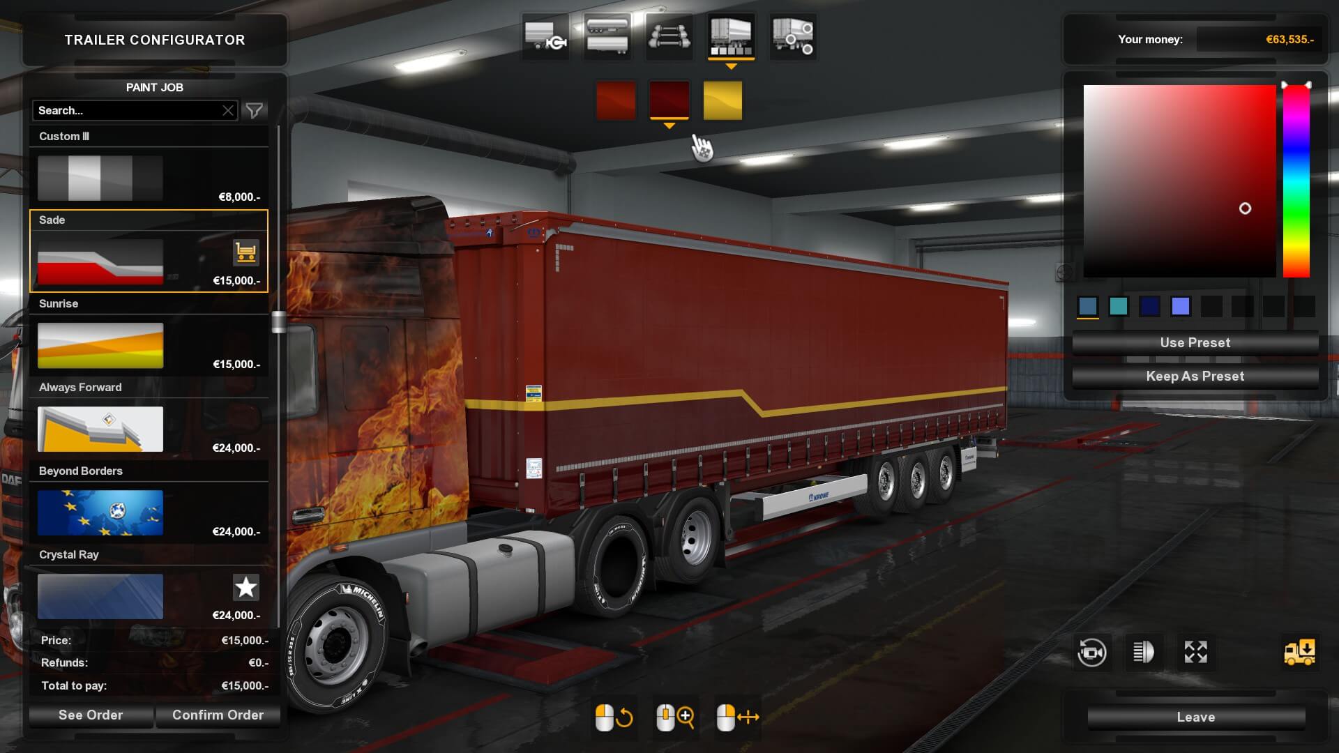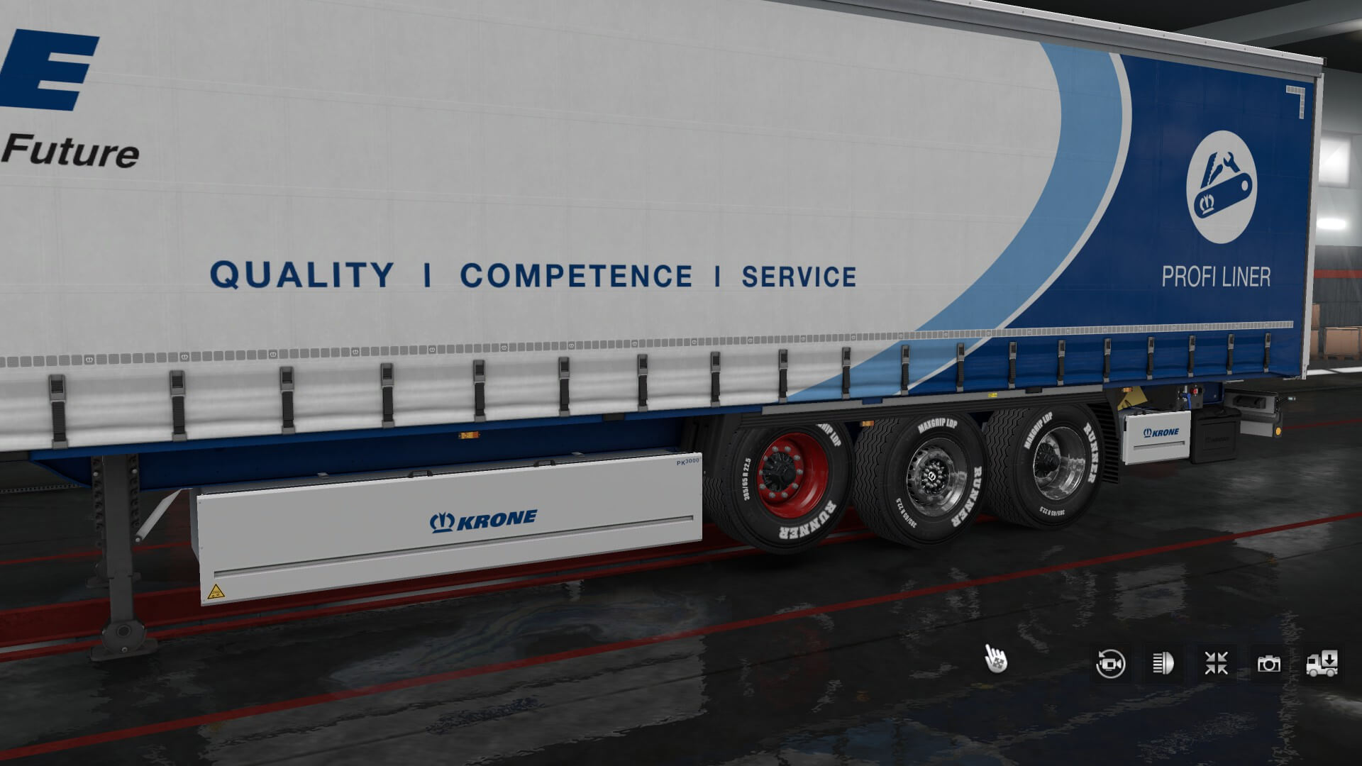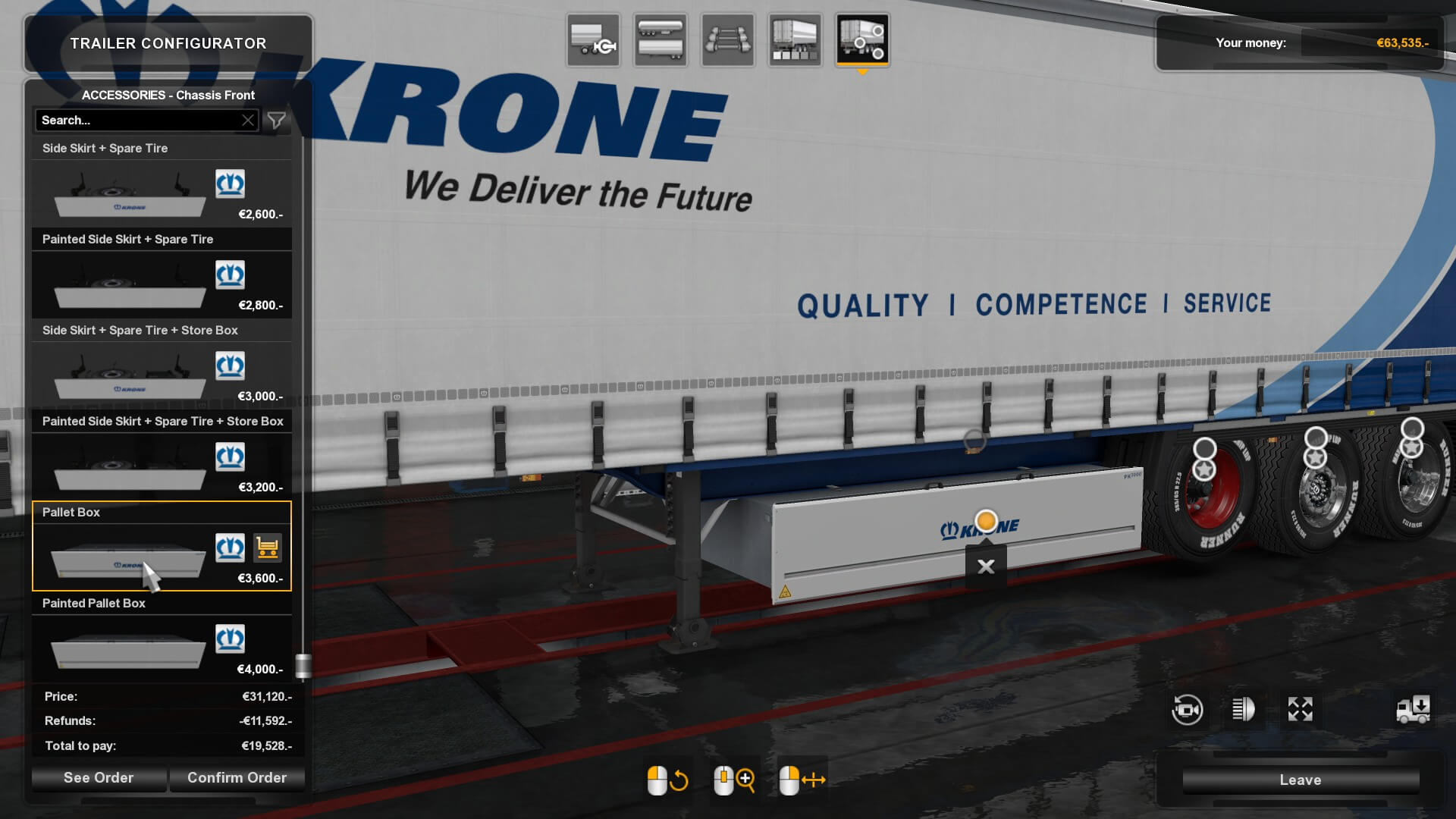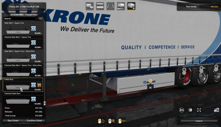 There are all kinds of other cool stuff added in the Krone Trailer Pack as well. Naturally, KRONE dealerships — as well as all kinds of hubs and in-cabin accessories (coolers, pennants, caps, coffee mugs, etc). Easy Rider tires are now available. There are parts I can get for my front and rear chassis. Finally, there are also rear bumpers and mudflaps. May as well deck out the truck while you’re doing the same with the trailers.