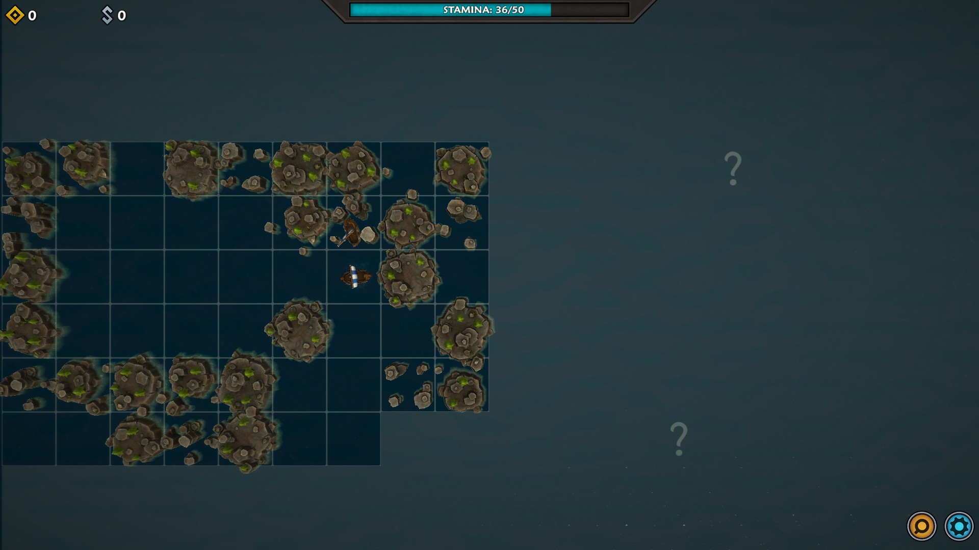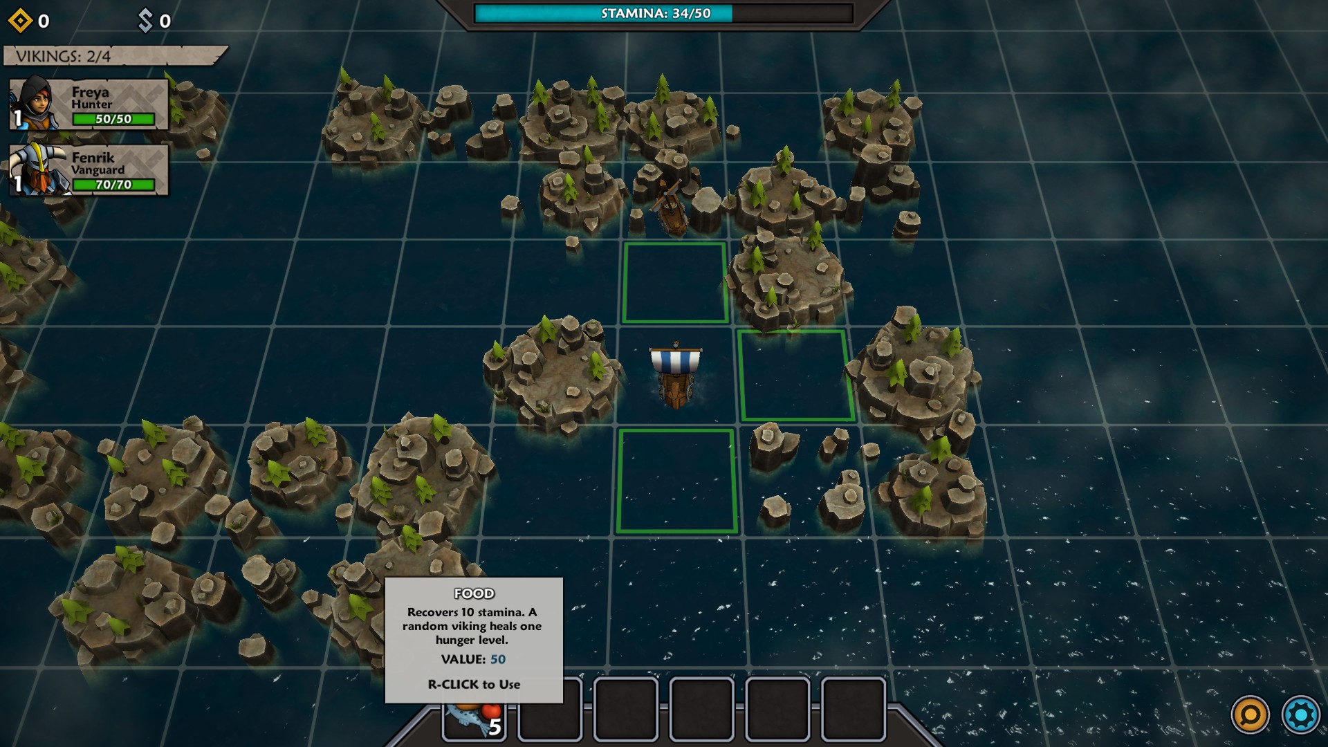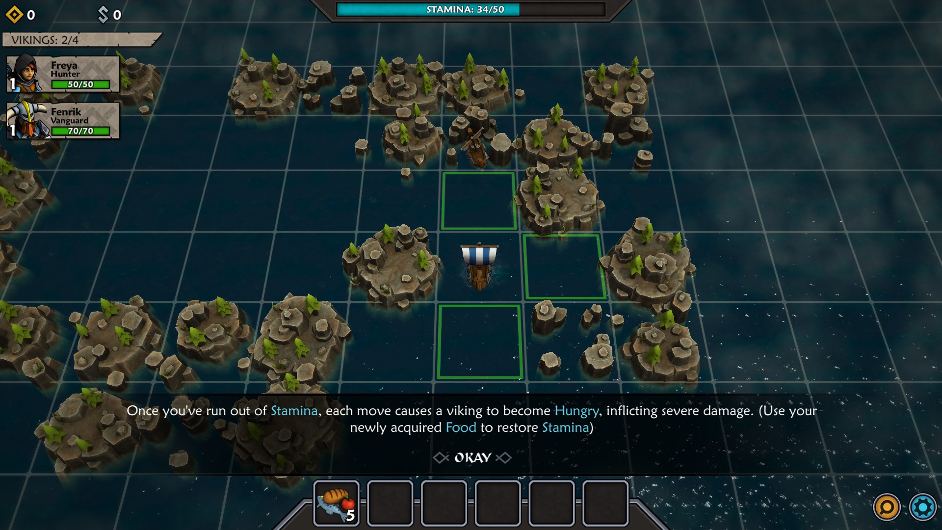 The map for Iron Tides is square-based and heavily shrouded with fog of war. You might think you could easily move from one square to the next until you run across an encounter, but that is where the first massive wrinkle comes into play. Each square you move into causes loss of stamina within the crew. When you run out of stamina, your crew will start to become hungry which will wreak severe damage to them. Then, if your crewmen/fighters go into battle hungry, they will start already injured. So, as carefully as possible (since you never know when your path will be blocked), you have to ease from square to square while always watching your stamina level. Between missions, you need to make sure and buy some food at Norhaven (which is your base of operations). During your travels, you might find food, or receive some as a reward for battles, however it is something you must pay careful attention to and, more importantly, plan ahead for accordingly.