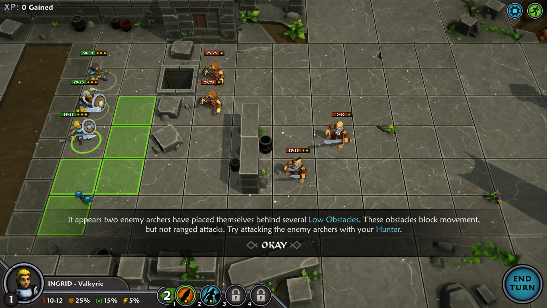 Interestingly, most of your turns are not consumed on the map! The majority of your time in Iron Tides is spent during battles. Strategic fighting is the mead and food of Iron Tides (like ‘meat and potatoes’—sorry, I’ll try harder). Whether you are confronting pirates, outposts, or other various non-spoilery predicaments, the incursions are where this game shines the most. Since you are usually outnumbered, you must figure out the most efficient way of defeating your increasingly tougher foes without getting your own troops killed. Each skirmish also contains various low obstacles, which block movement, but not Line of Sight, and higher obstacles that block both traverse and LoS.