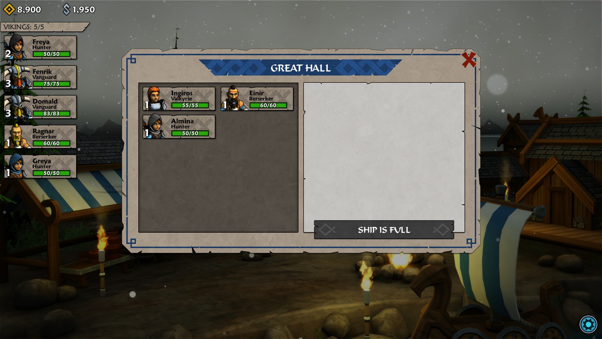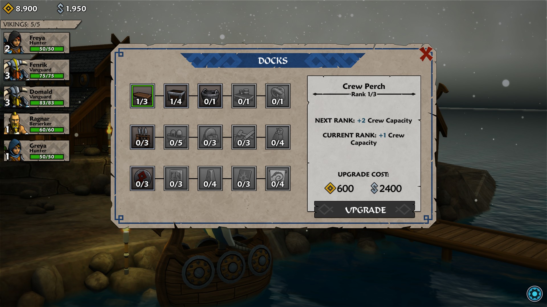 At first, Norhaven is simply a marketplace to buy items and sell goods that you have plundered along the way. When you complete a quest, you are rewarded with Hacksilver and Glory, both of which can be spent on various things. Shortly after completing a couple of quests, the Great Hall will open for you to acquire more crewmen (which may not be the only means to do so). A few more victories along the way, then the Docks will open for you to start adding to and/or upgrading your ship.