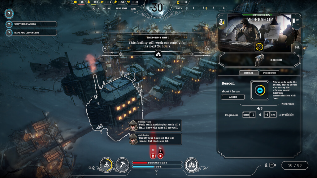 I alluded earlier that supplies will later come from outside the crater, and I just mentioned the beacon. One of the earlier objectives you’ll complete for Frostpunk’s main story-thread revolves around you researching and building a beacon, as well as equipping scouts to head out and investigate events out beyond the crater. It’s here where you find new citizens (remember, this takes place over days), gain new opportunities, and advance the story.