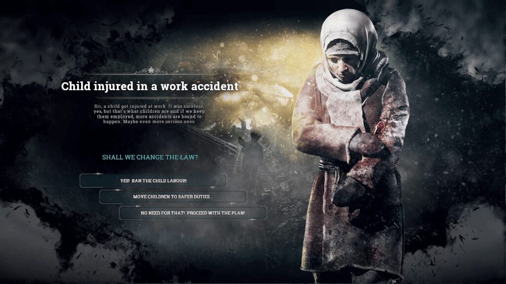 It’s not a branch that I followed, but even my path then allowed me to set those children to work in the safer, more technical environments of the Medicine Houses and Workshops. The child labour law, should you enact it, takes you down an understandably darker route, messages of children wounded and injured at work appear, and when society begrudgingly accepts it you’re then offered the chance to further enable even more dangerous tiers of child labour.